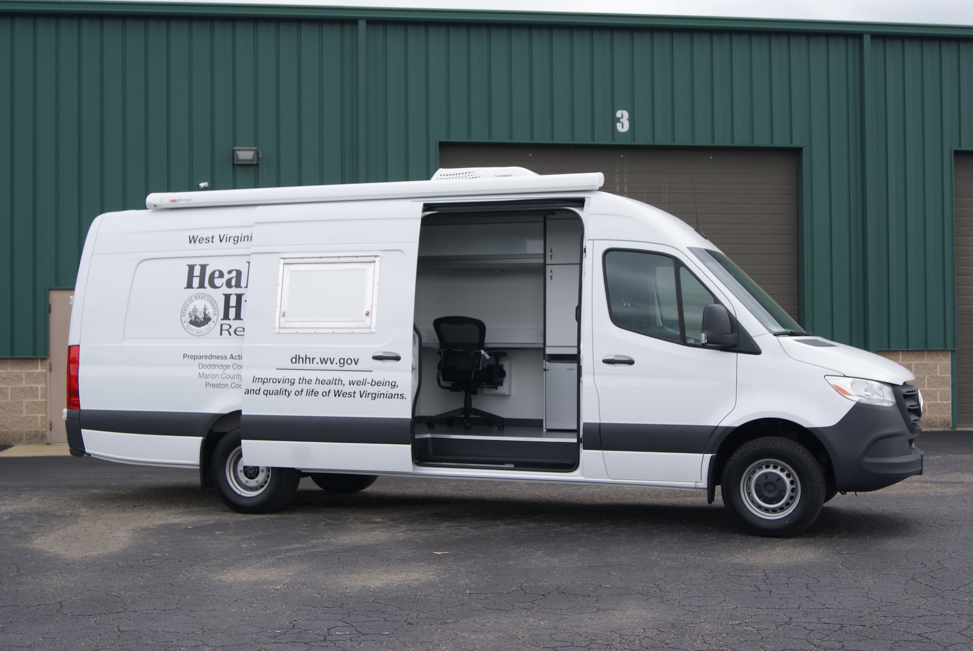 Recently, we sent out sixteen of the nineteen mobile immunization sprinter vans requested by the West Virginia Department of Health and Human Resources. Each one features two workstations, a blood draw chair, ACE overhead aluminum cabinets, one Cradlepoint antenna, easy to disinfect solid surface counter tops, and more!