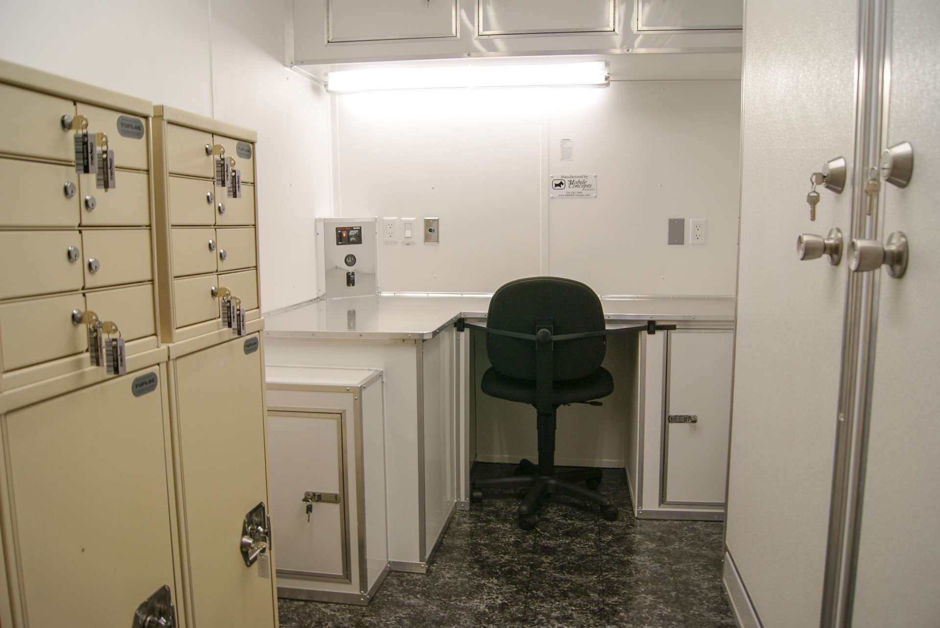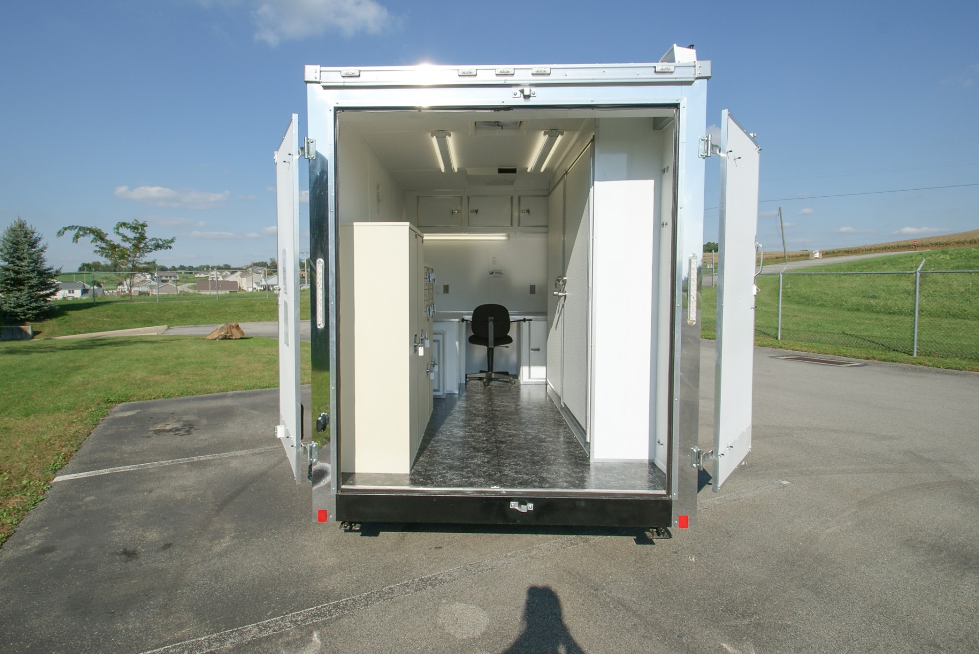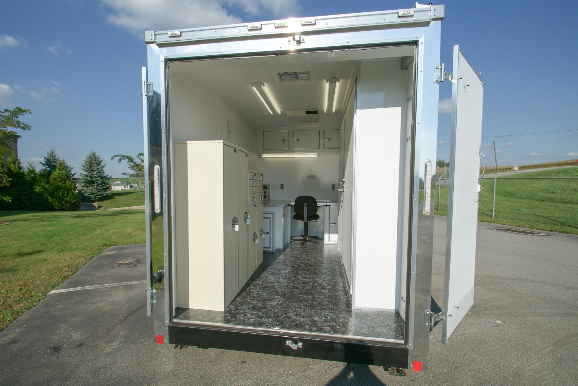 This Command 16 Arms Supply Trailer was custom-built for the Barking Sands Police Department in Hawaii to provide secure, efficient transport and storage of their weapons inventory, including M4 assault rifles, military shotguns, and M9 pistols. Designed with both safety and functionality in mind, the trailer features a compact, rugged build and custom storage cabinets to ensure quick access and organized transport of critical equipment. To enhance operational flexibility, the unit is also equipped with communication capabilities, allowing it to double as a Mobile Command Center when needed. A dedicated workstation was installed to give personnel a space for weapon maintenance and cleaning, supporting readiness and proper upkeep in the field.