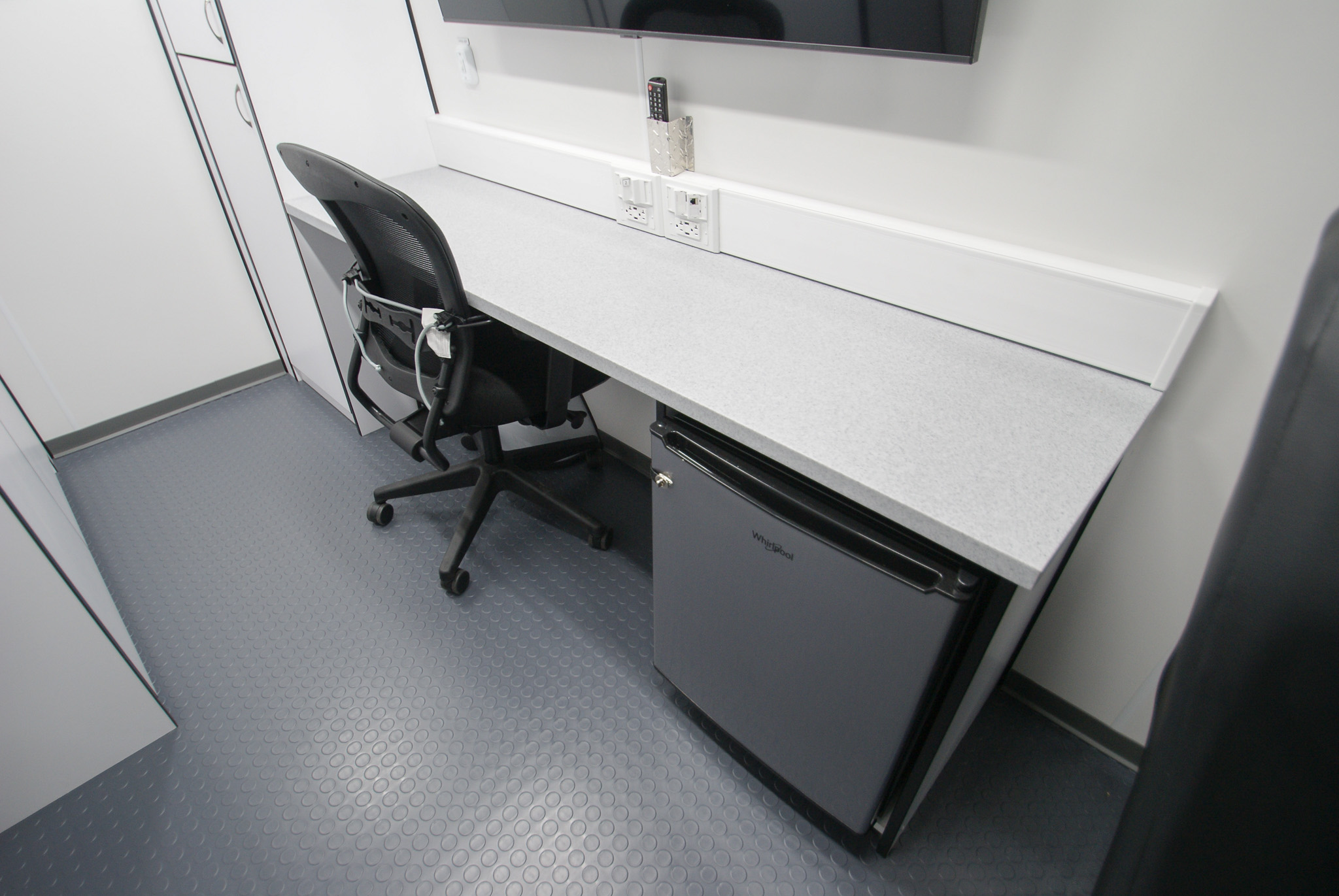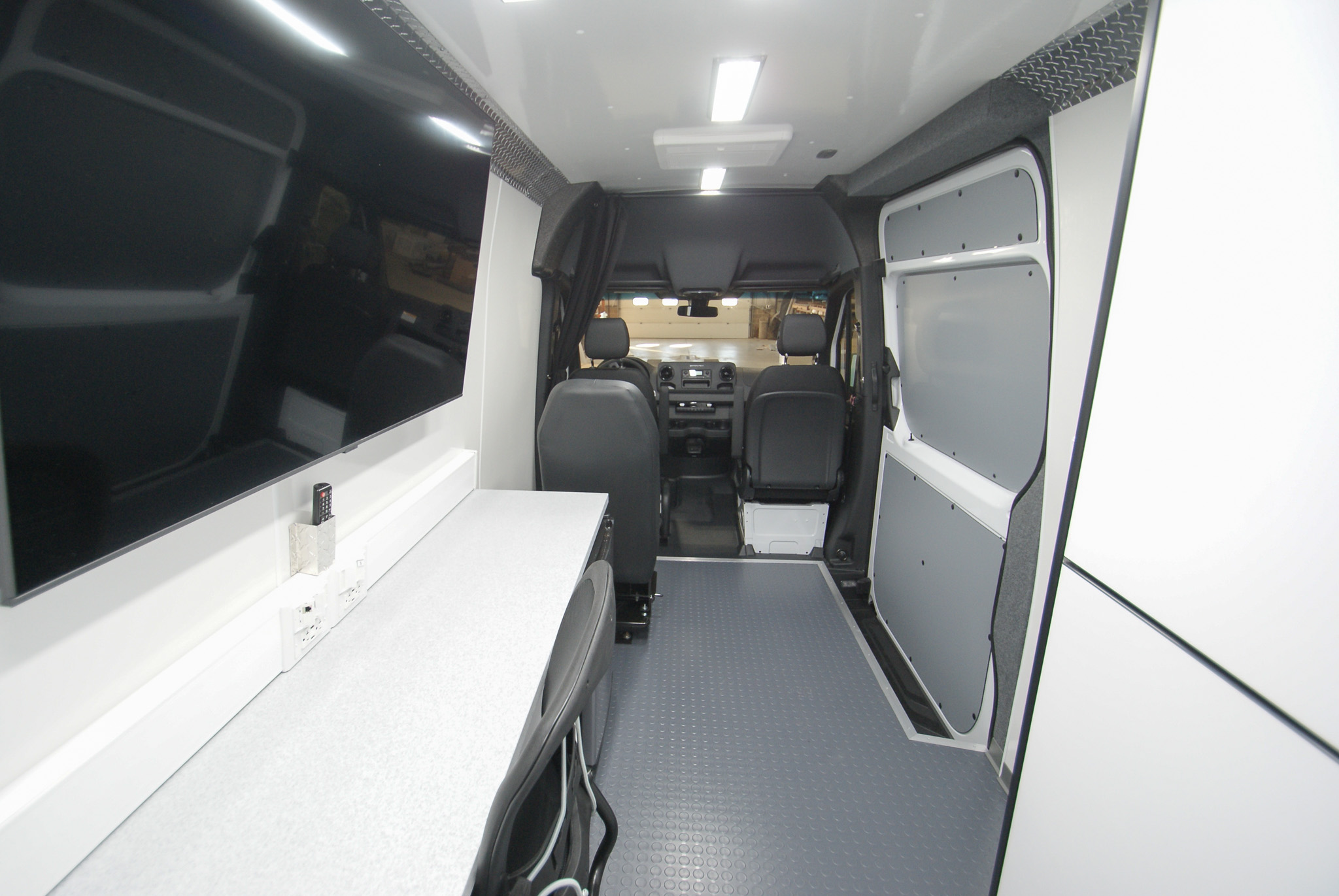 This Command 1WS was made for Westbrook Health Services in Parkersburg, WV to provide a versatile mobile workspace for outreach and service operations. It features one workstation, a second passenger seat, one 55″ Samsung TV, one refrigerator, two storage cabinets, one Cradlepoint WiFi router & antenna, rear storage shelving with cargo netting, and one Fiamma awning.