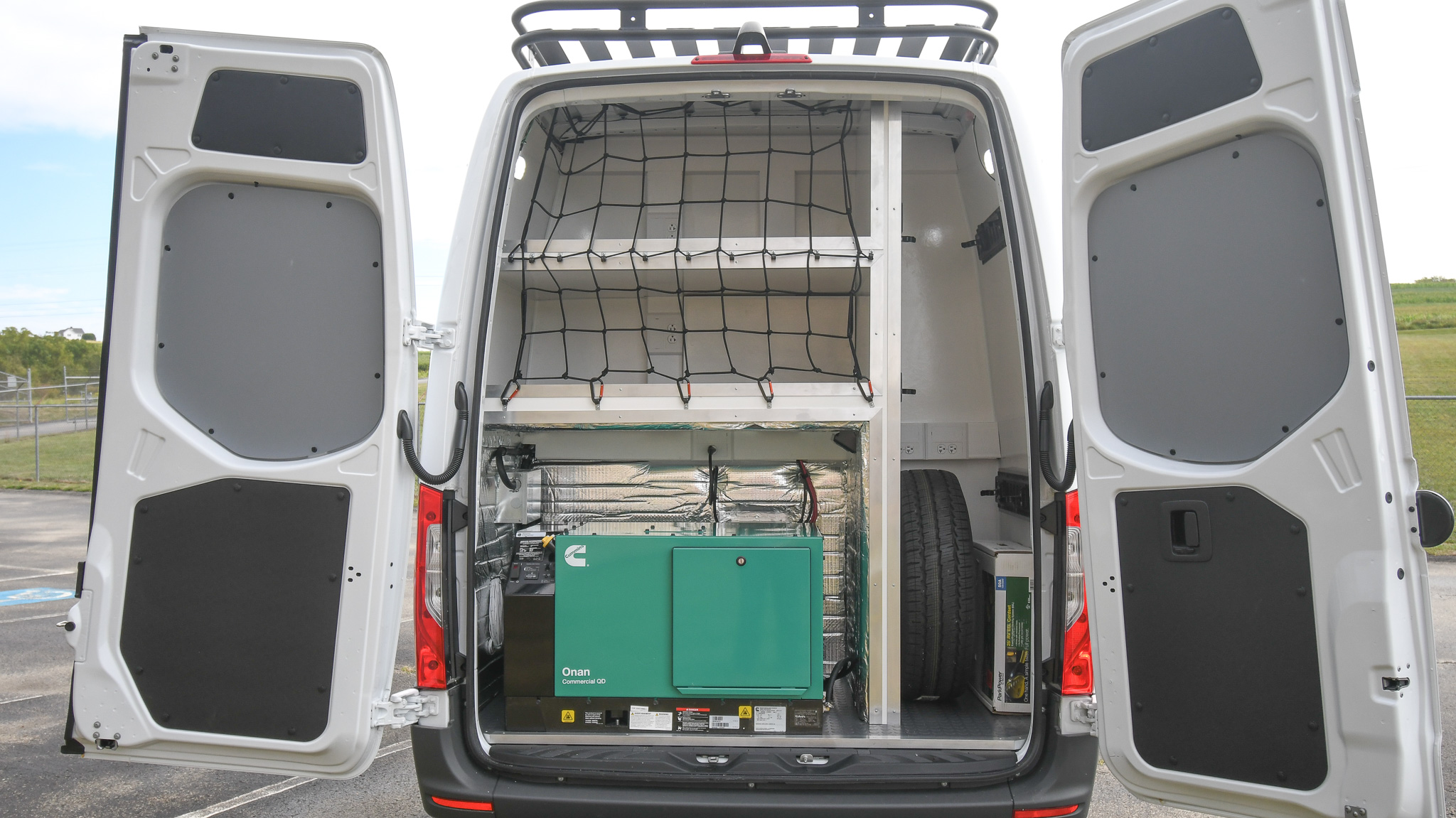 - Rear storage shelving with cargo netting and wall brackets for tools and equipment