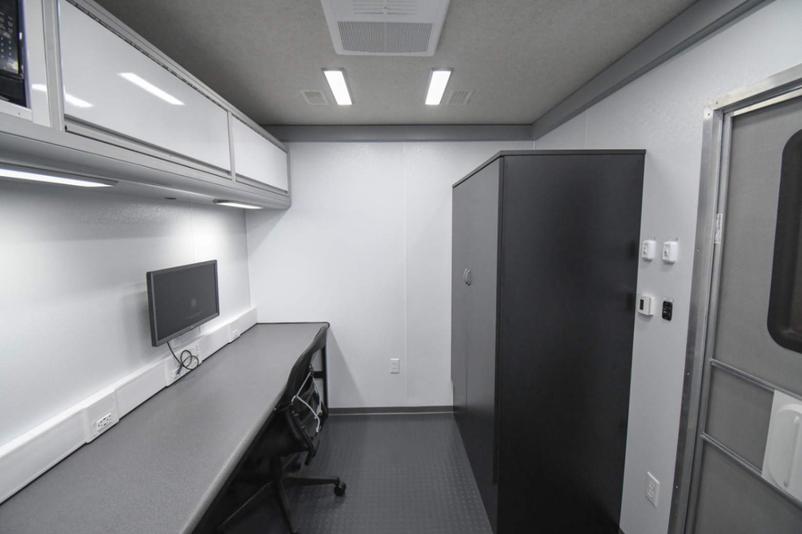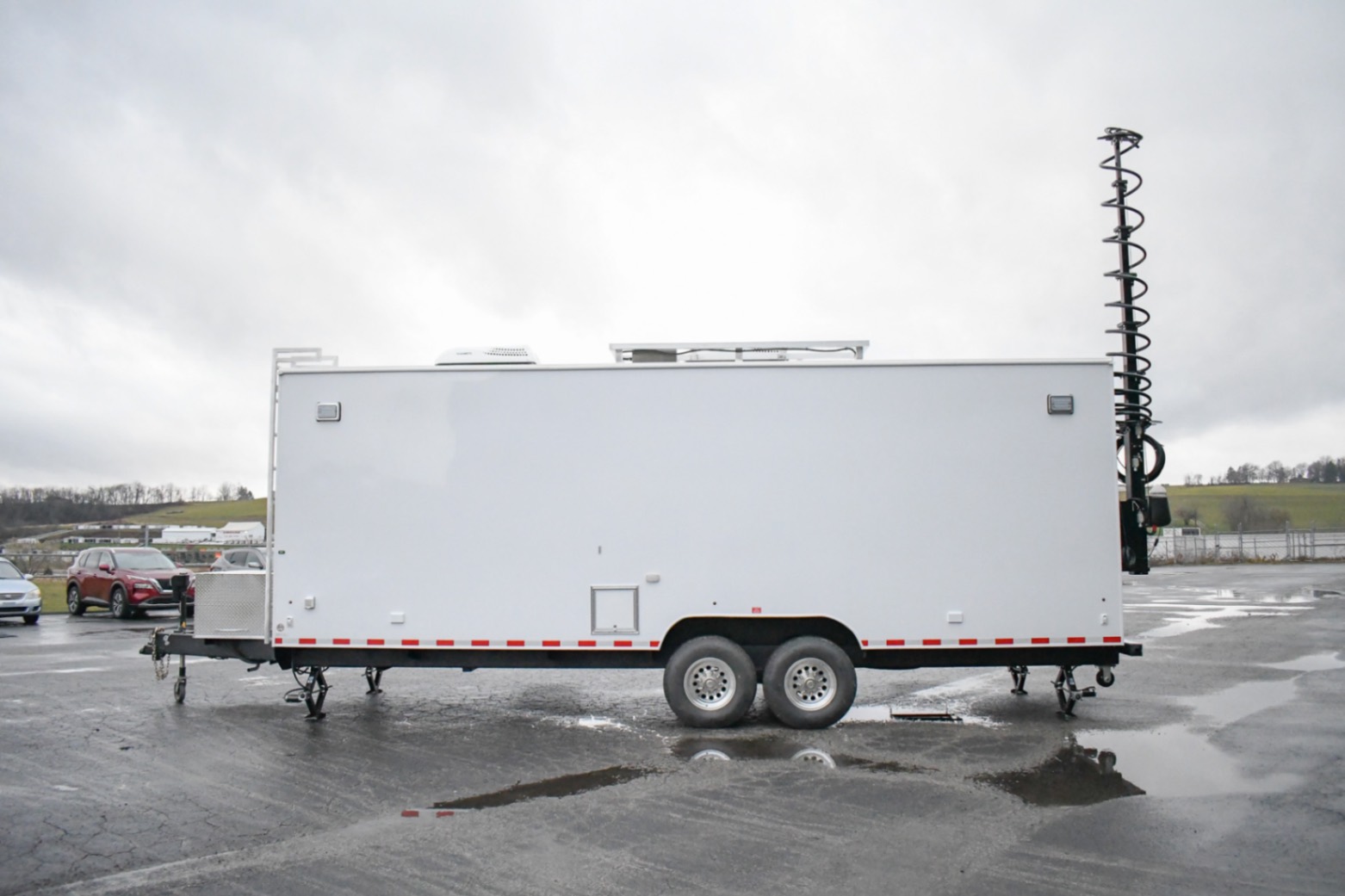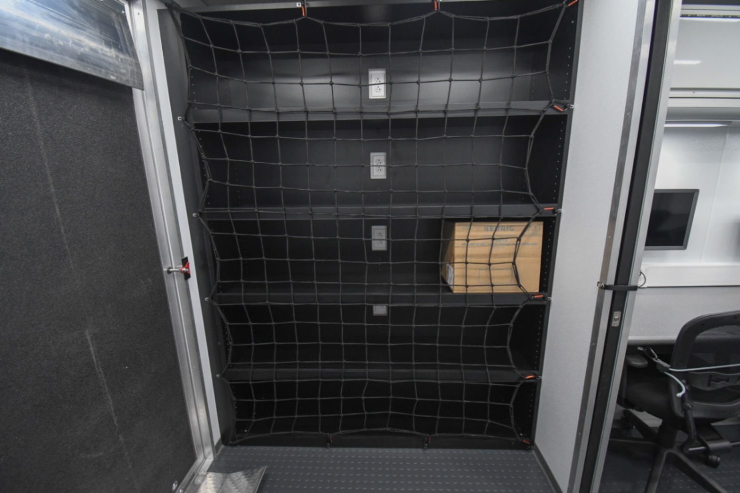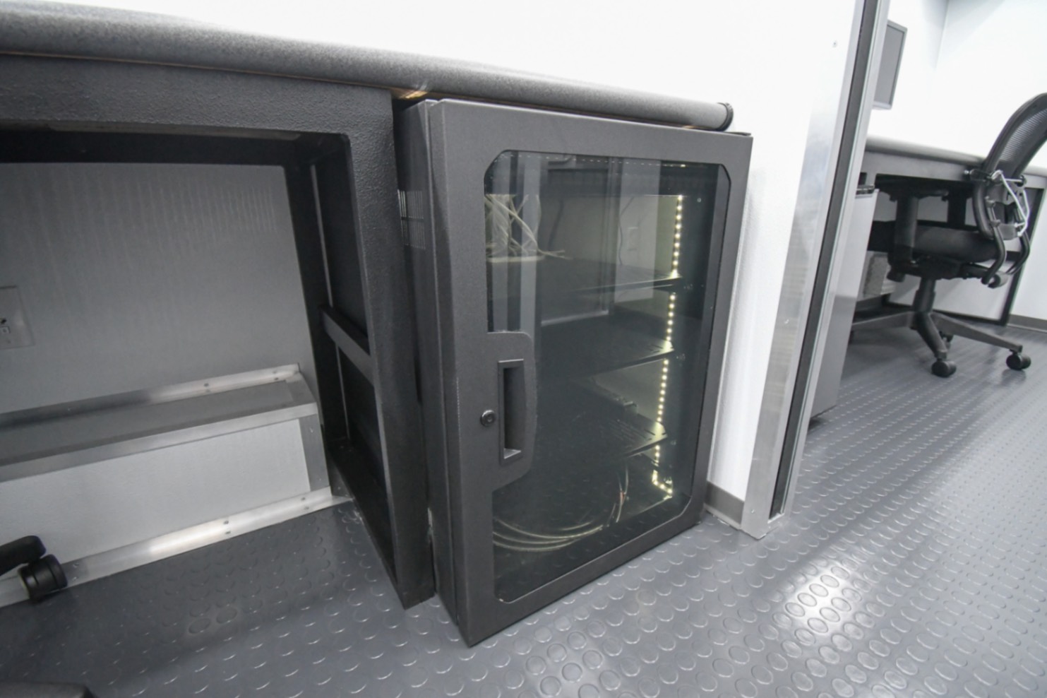 This Command 31-4WS was made for the Naval Surface Warfare Center (NSWC) in Crane, IN. Not only does it serve as a command center, but it also acts as a drone observation trailer. For that purpose, it’s been equipped with four workstations, one 62×52″ roll-up door, three 24″ monitors, one electronics rack with an exterior access door, one storage cabinet with four shelves, rear shelving with cargo netting, a floatograph mast, a 5′ wide rear ramp door, one roof access ladder, and an 8×8 roof antenna rail system.