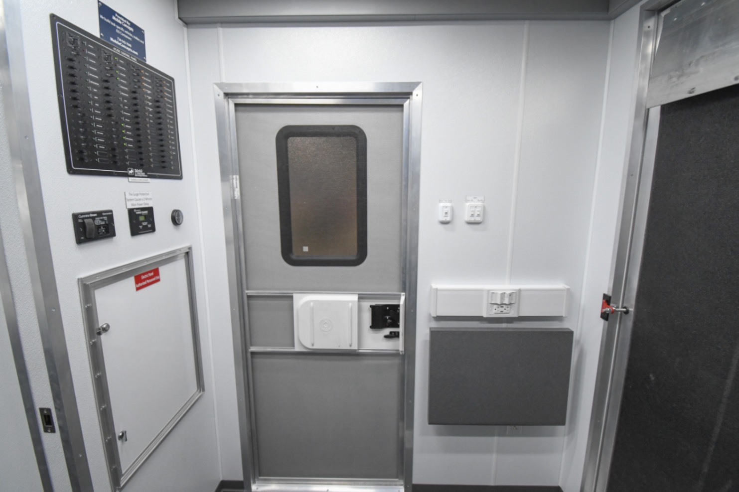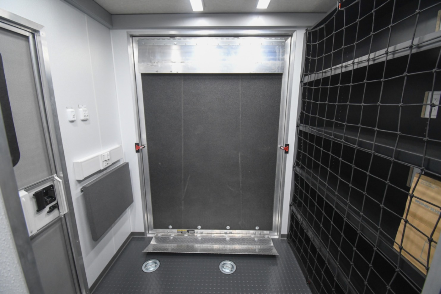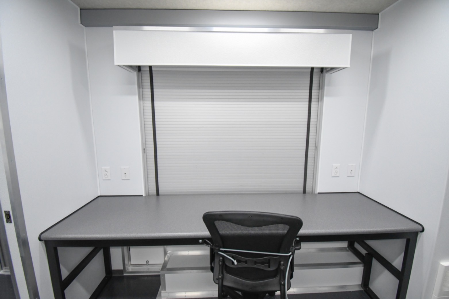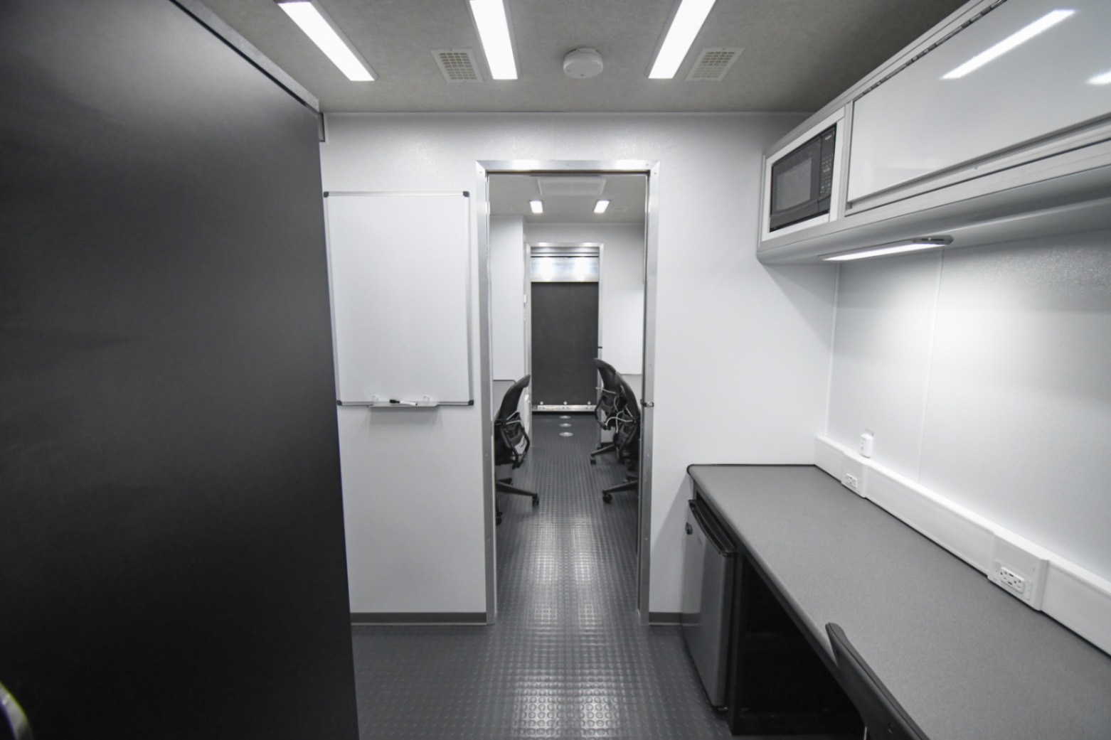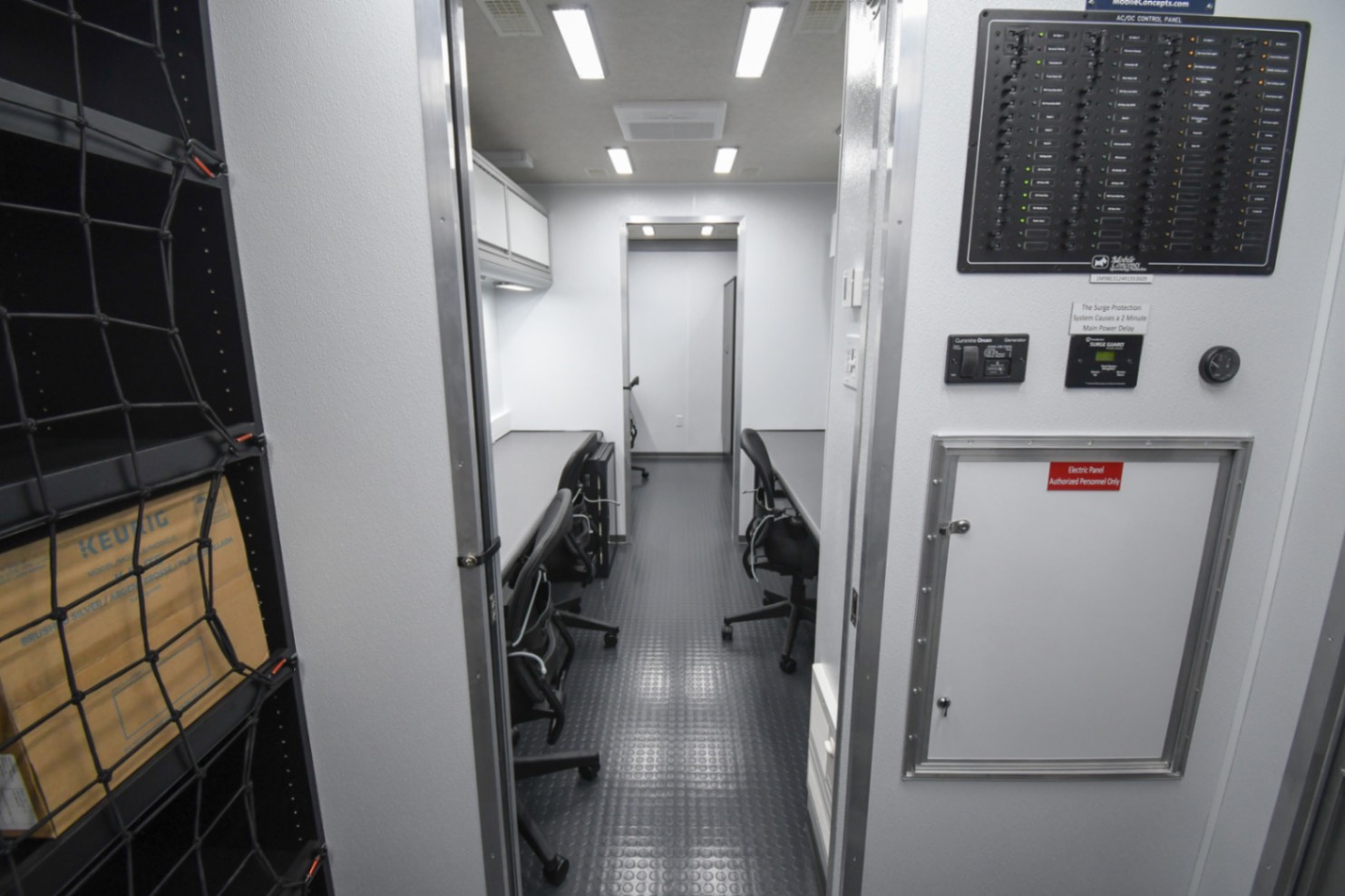This Command 31-4WS was made for the Naval Surface Warfare Center (NSWC) in Crane, IN. Not only does it serve as a command center, but it also acts as a drone observation trailer. For that purpose, it’s been equipped with four workstations, one 62×52″ roll-up door, three 24″ monitors, one electronics rack with an exterior access door, one storage cabinet with four shelves, rear shelving with cargo netting, a floatograph mast, a 5′ wide rear ramp door, one roof access ladder, and an 8×8 roof antenna rail system.