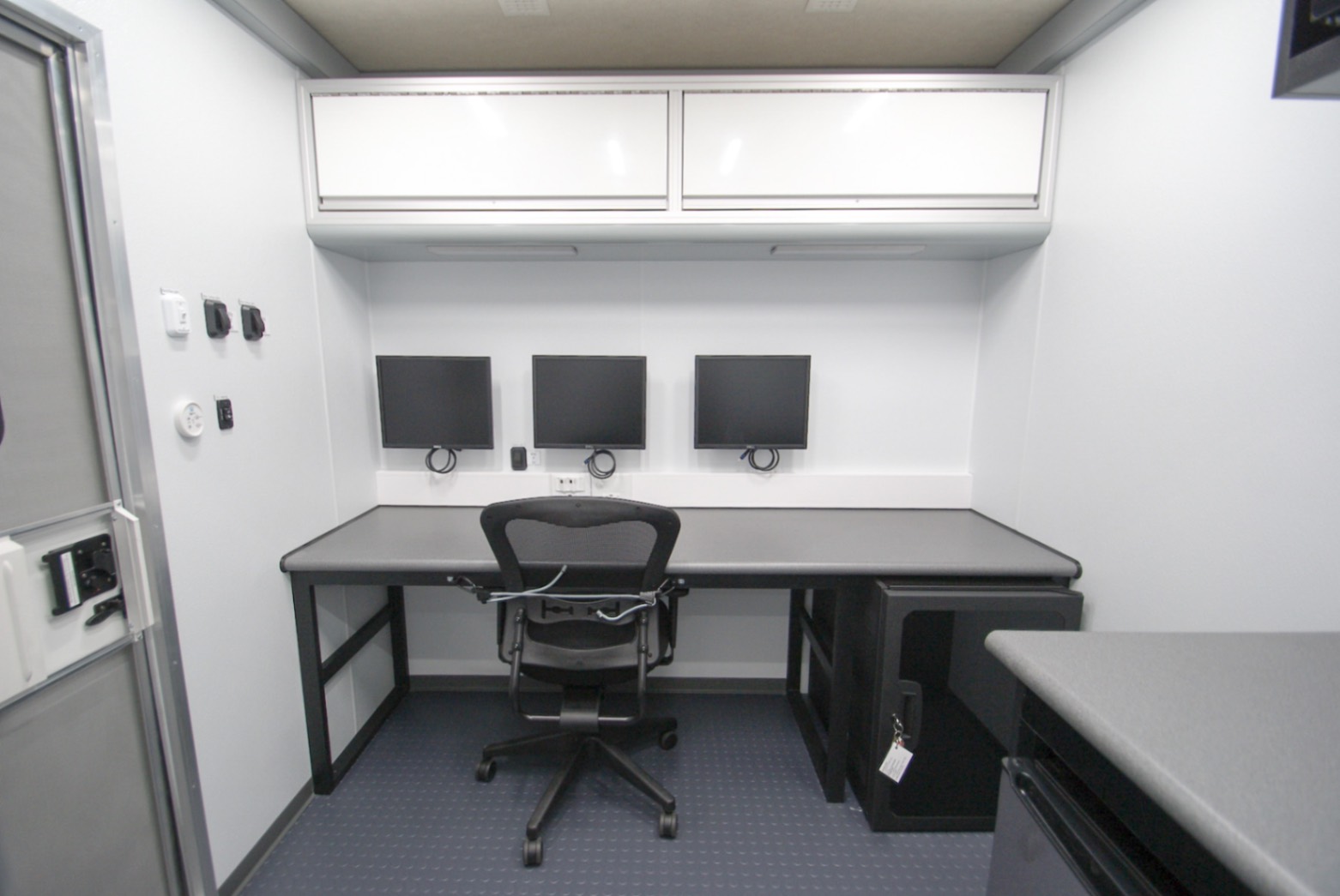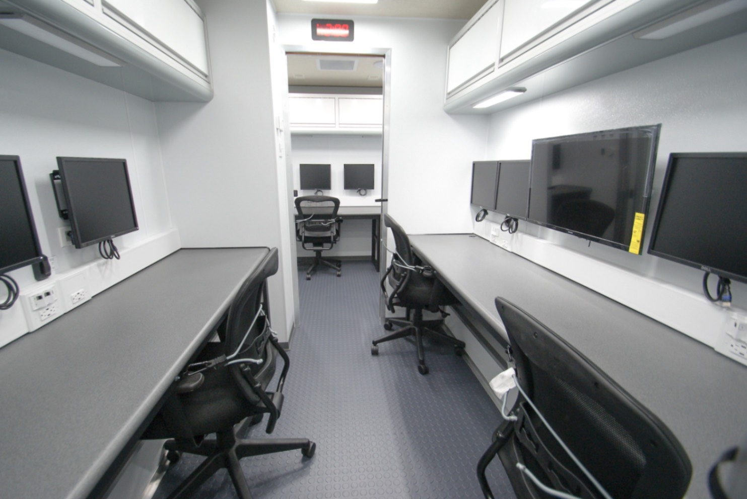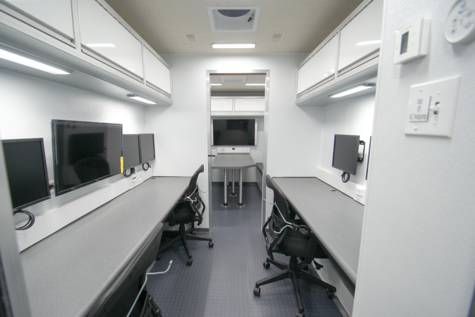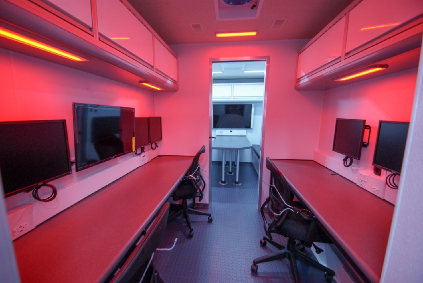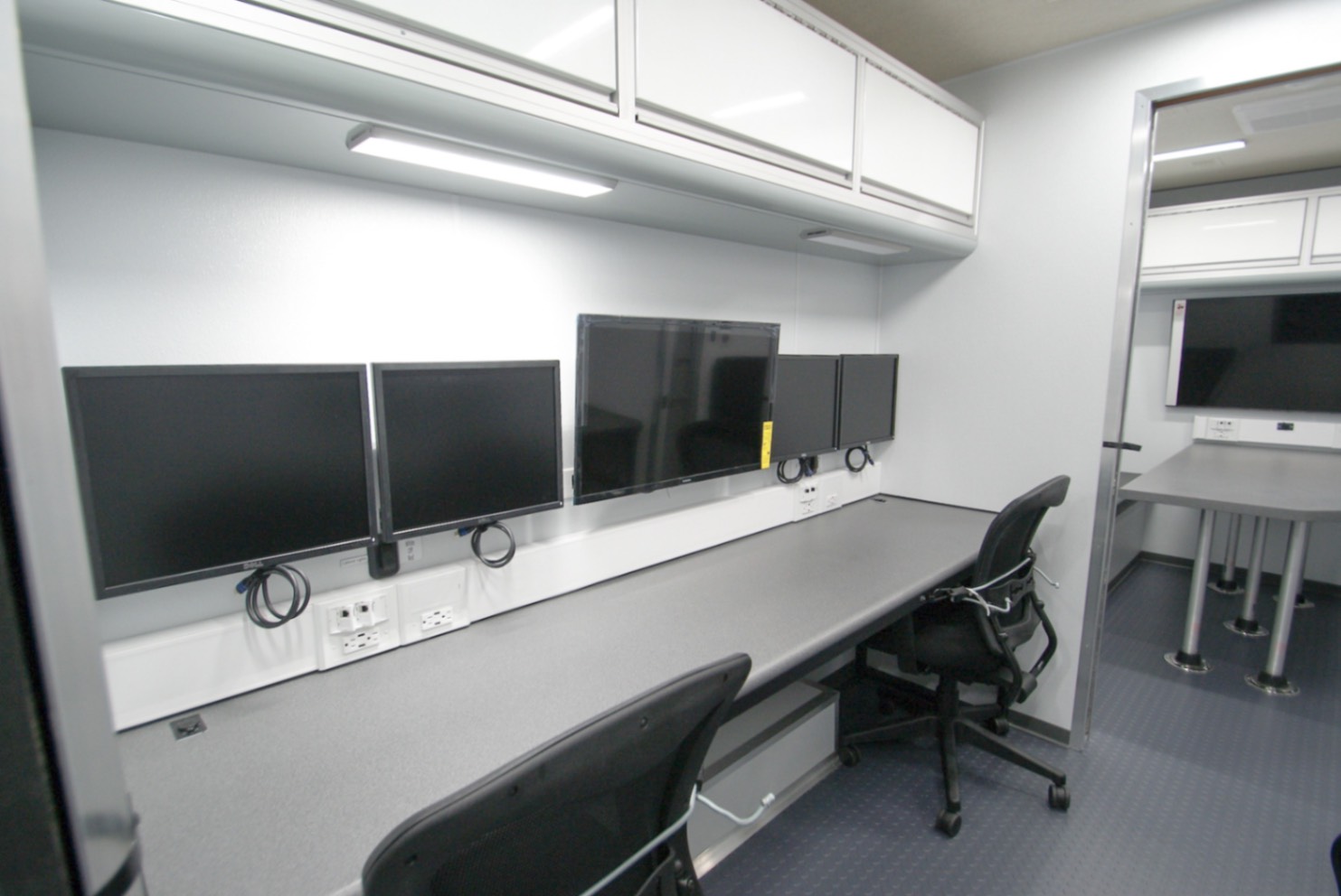 This Command 31-4WS was custom-built for the Calhoun County Emergency Management Agency in Jacksonville, AL, to serve as a mobile communications base during emergency events. To maximize efficiency, this unit is equipped with four workstations, a dedicated conference area for briefings, one electronics rack to host a 20-amp receptacle and eight outlet strip, nine 17″ monitors, one 50″ LED TV with BluRay, one 32″ LED TV, six FRC LED flush-mount scene lights, a four camera security system, two wireless access points, two cell booster antennas, and a Cradlepoint WiFi router with two antennas to ensure coordination and visibility while responding to urgent emergencies. Additionally, their trailer features a kitchenette with a refrigerator, microwave, and Keurig for convenience during lengthy deployments.