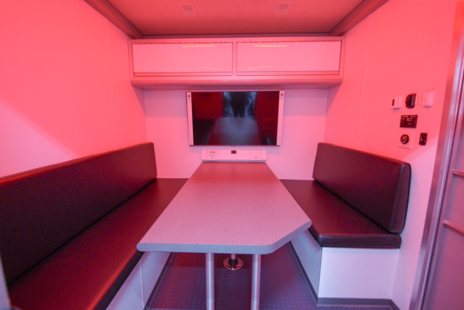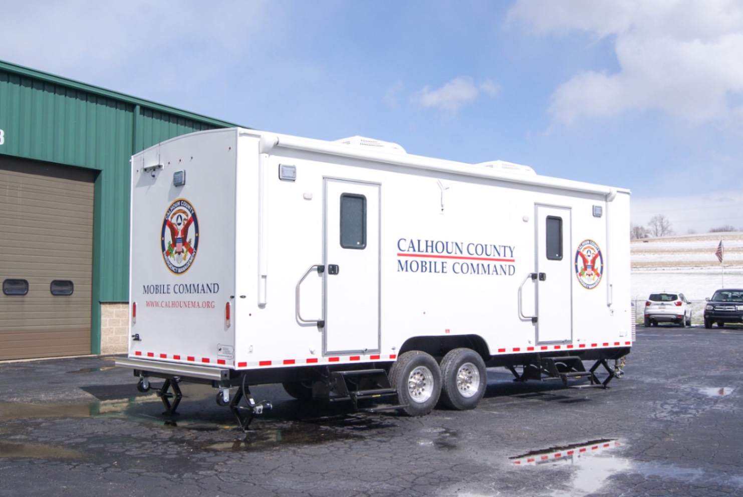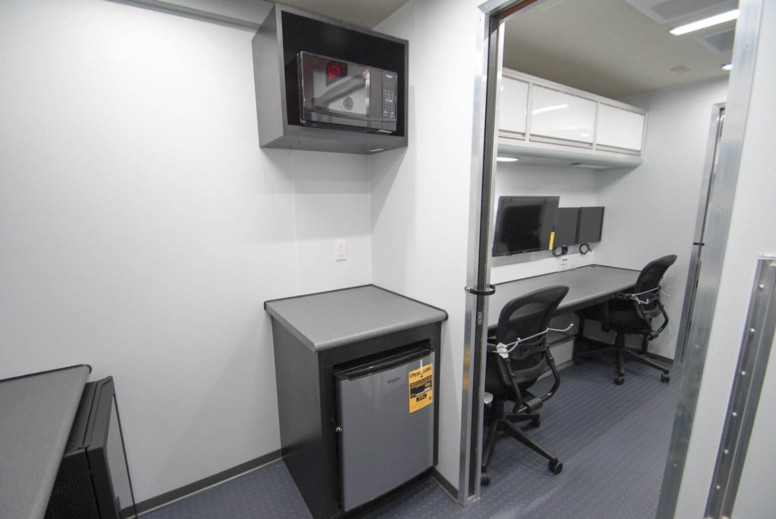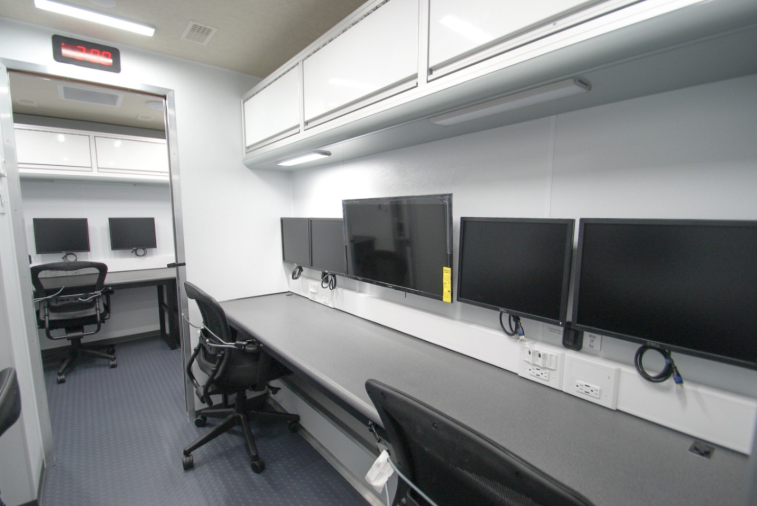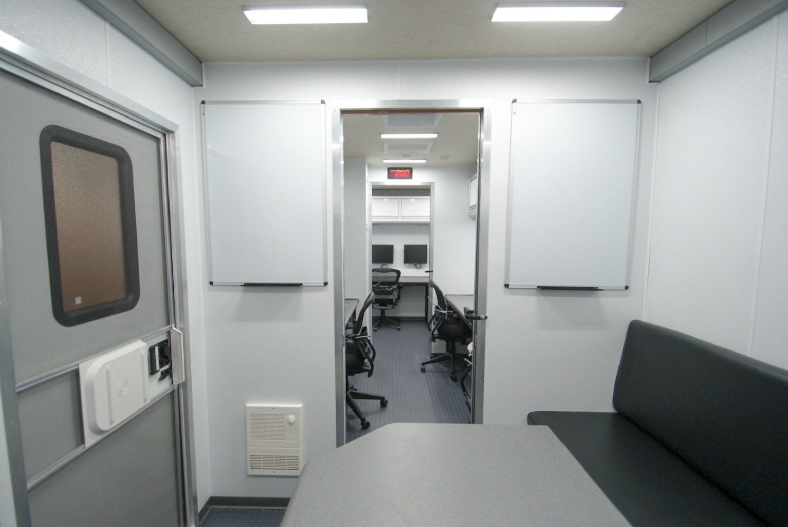 This Command 31-4WS was custom-built for the Calhoun County Emergency Management Agency in Jacksonville, AL, to serve as a mobile communications base during emergency events. To maximize efficiency, this unit is equipped with four workstations, a dedicated conference area for briefings, one electronics rack to host a 20-amp receptacle and eight outlet strip, nine 17″ monitors, one 50″ LED TV with BluRay, one 32″ LED TV, six FRC LED flush-mount scene lights, a four camera security system, two wireless access points, two cell booster antennas, and a Cradlepoint WiFi router with two antennas to ensure coordination and visibility while responding to urgent emergencies. Additionally, their trailer features a kitchenette with a refrigerator, microwave, and Keurig for convenience during lengthy deployments.