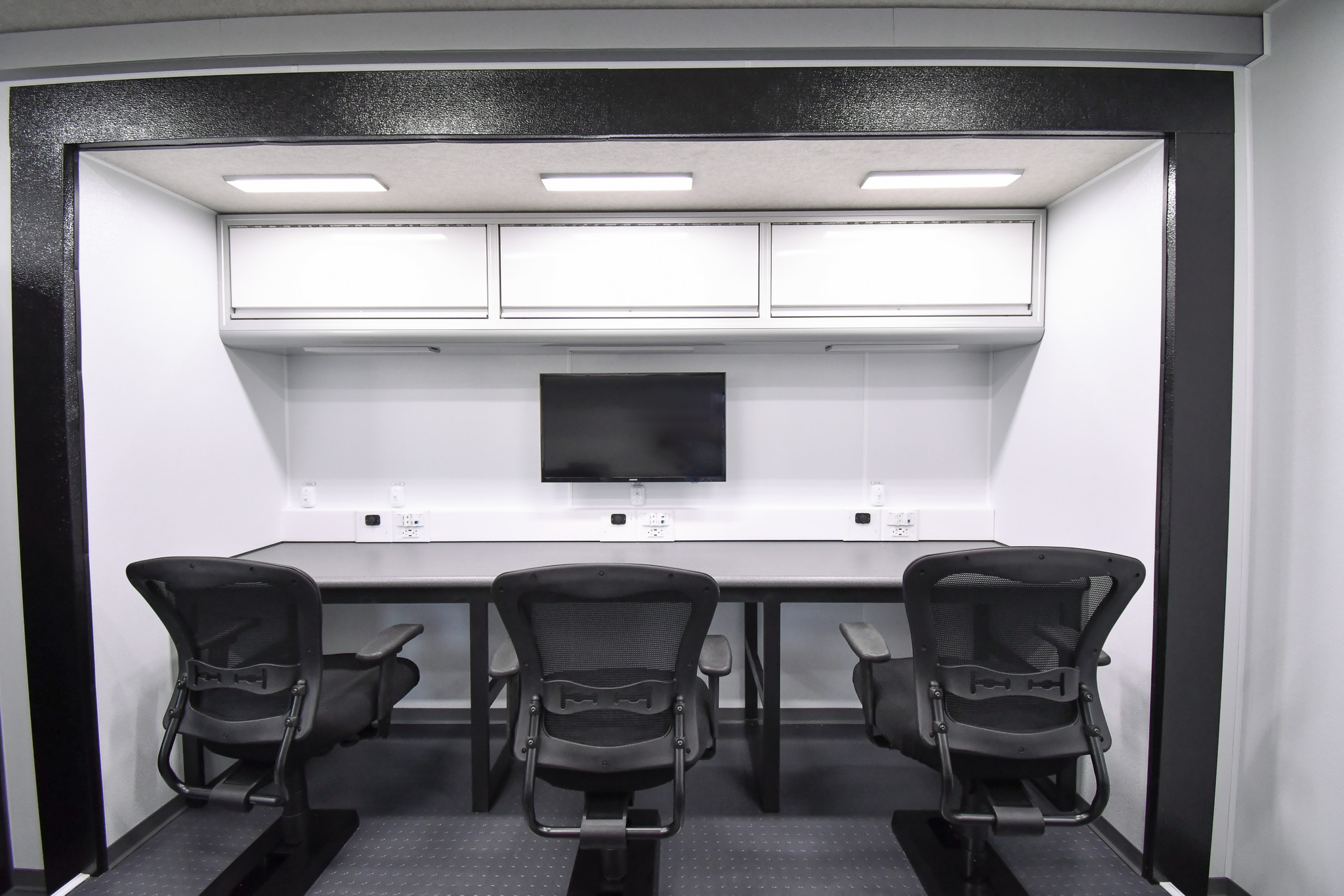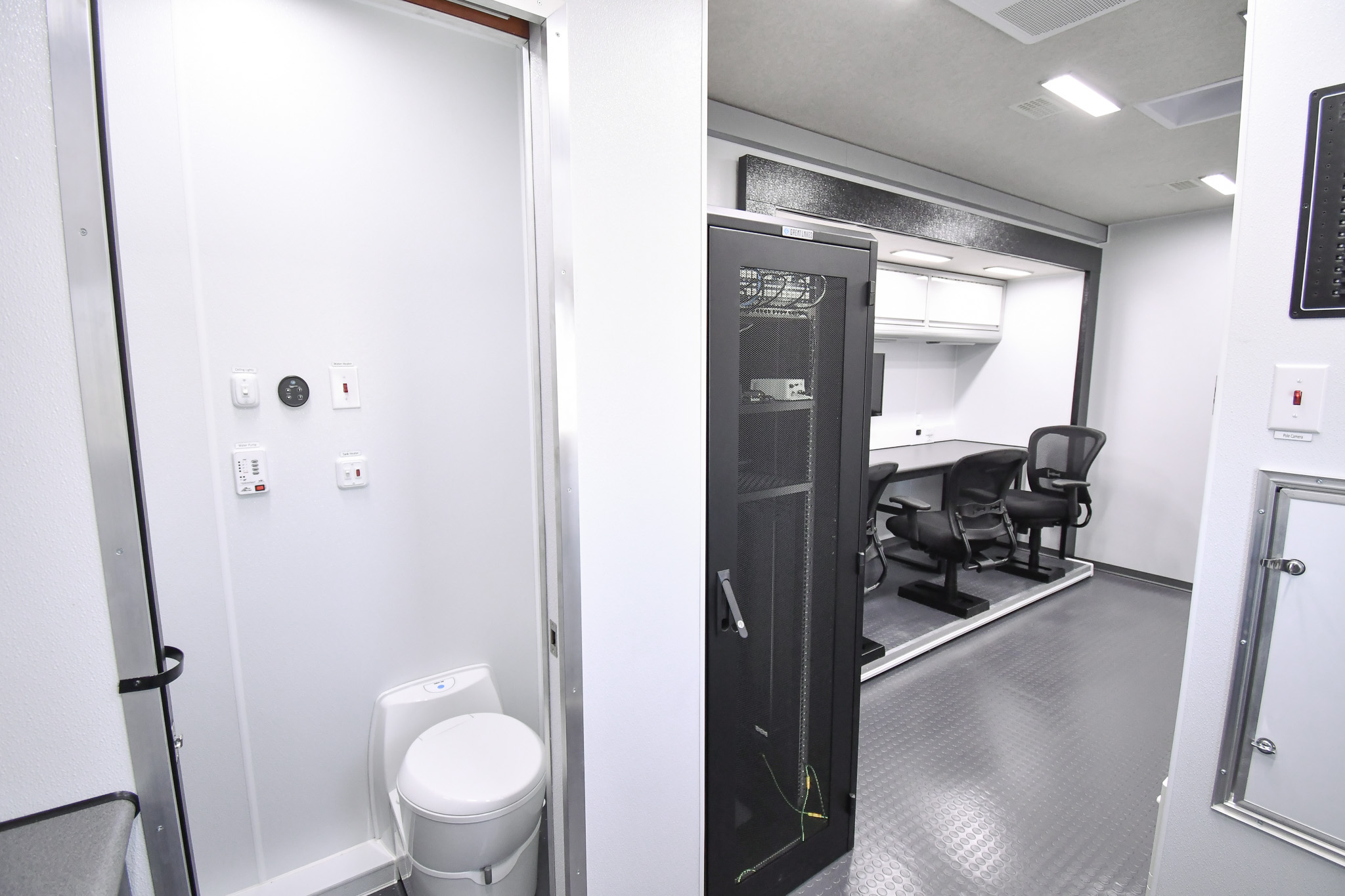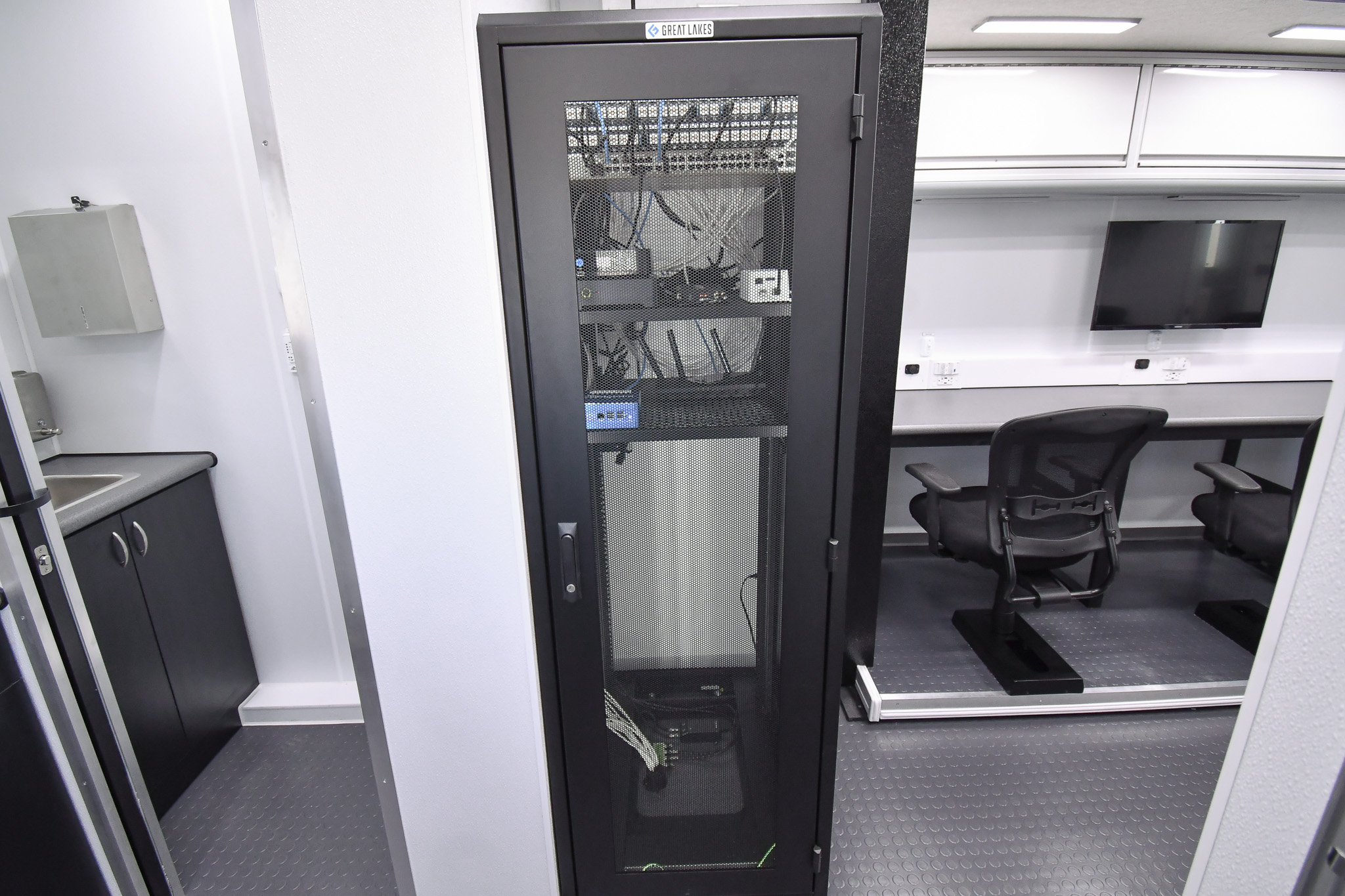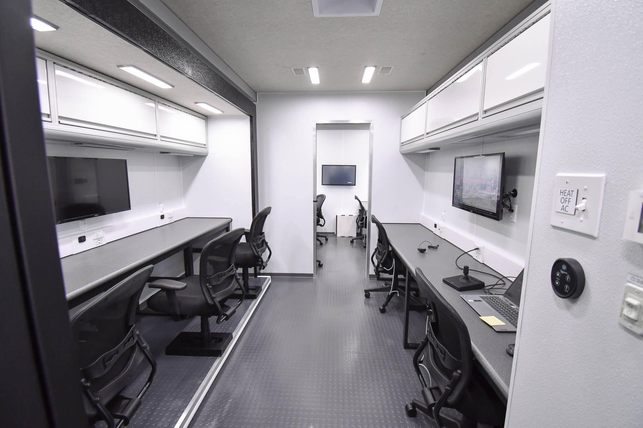 This Command 35-8WS SO was custom-built for the Department of Juvenile Justice in Tallahassee, FL. In order to accommodate large groups of personnel and hold a wide variety of tech, this trailer was customized to include one electric slideout, eight workstations, one 37u equipment rack with a 48-port patch panel, two 16-outlet electrical strips, and dedicated 20-amp receptacle, one three-camera Furrion vehicle observation system with a 7″ monitor, an eight-phone Sangoma system, two 32″ TVs, one 32″ touch screen monitor, one Cradlepoint WiFi router and antenna, one Winegard DirectTV satellite with two receivers, two battery-operated smoke/CO2 alarms, and an Axis camera with a joy stick controller.