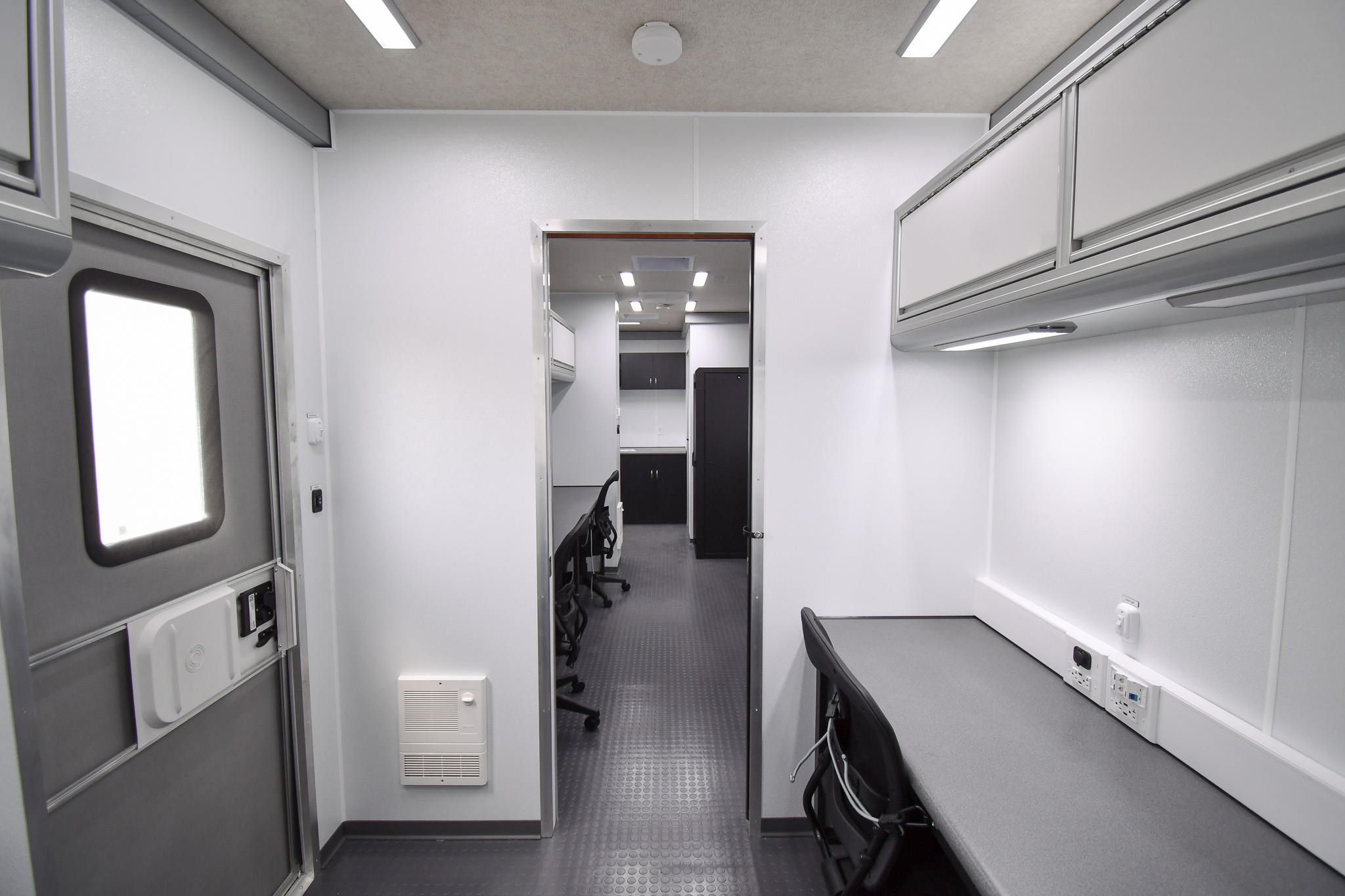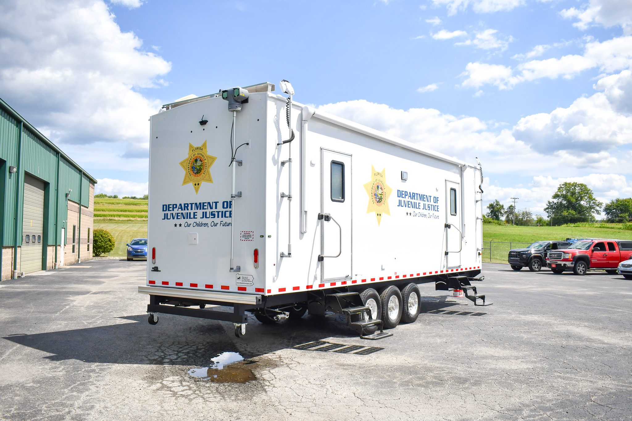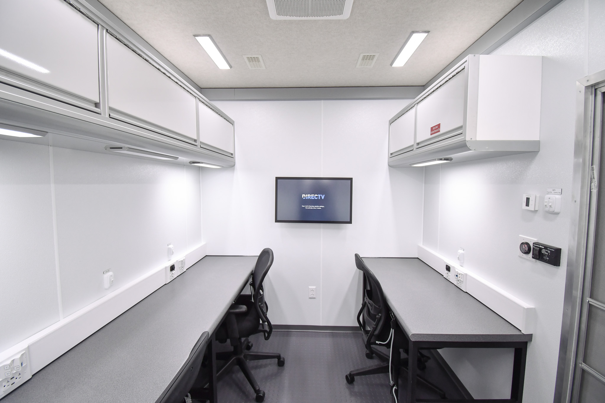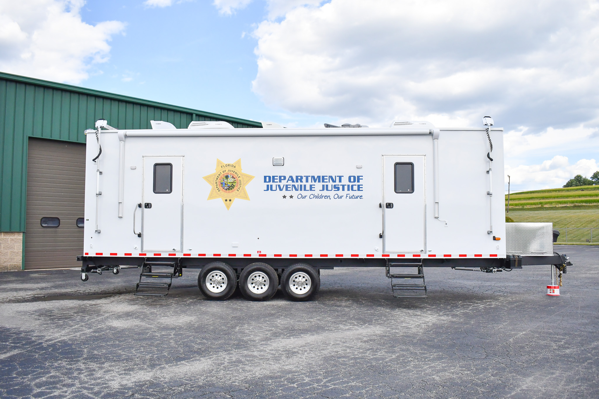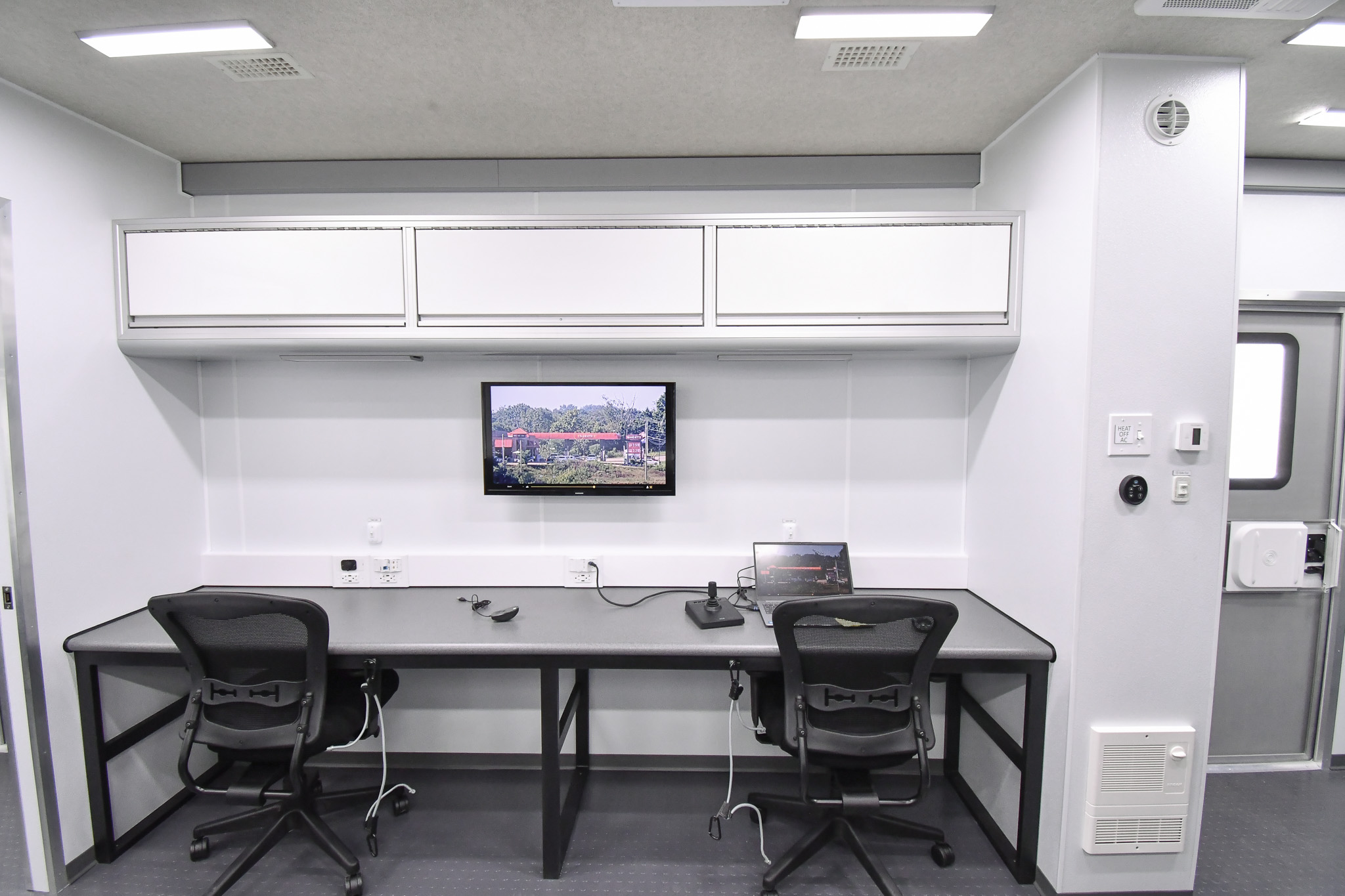 This Command 35-8WS SO was custom-built for the Department of Juvenile Justice in Tallahassee, FL. In order to accommodate large groups of personnel and hold a wide variety of tech, this trailer was customized to include one electric slideout, eight workstations, one 37u equipment rack with a 48-port patch panel, two 16-outlet electrical strips, and dedicated 20-amp receptacle, one three-camera Furrion vehicle observation system with a 7″ monitor, an eight-phone Sangoma system, two 32″ TVs, one 32″ touch screen monitor, one Cradlepoint WiFi router and antenna, one Winegard DirectTV satellite with two receivers, two battery-operated smoke/CO2 alarms, and an Axis camera with a joy stick controller.