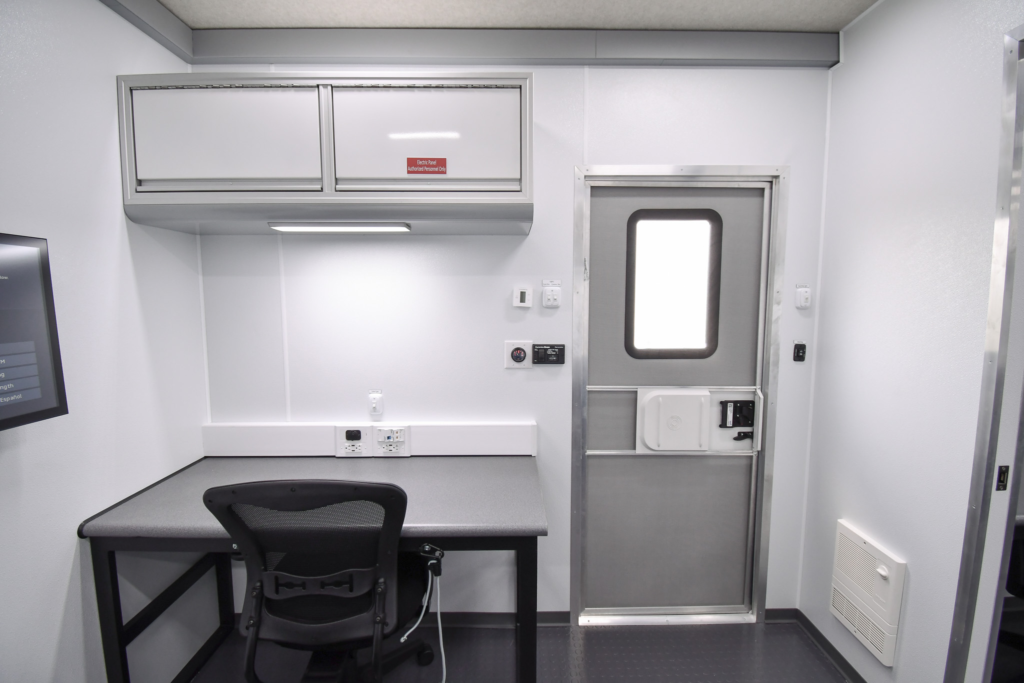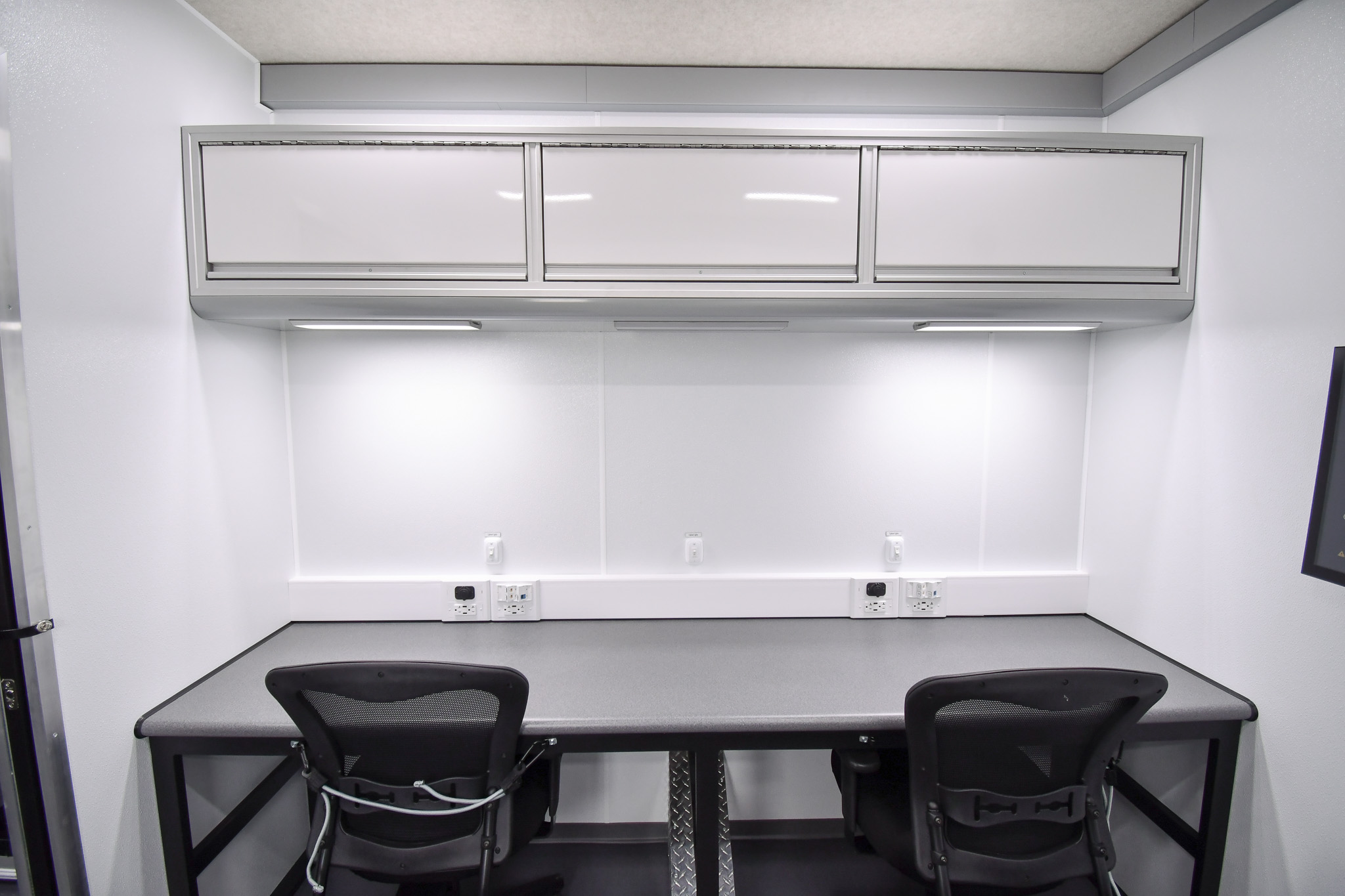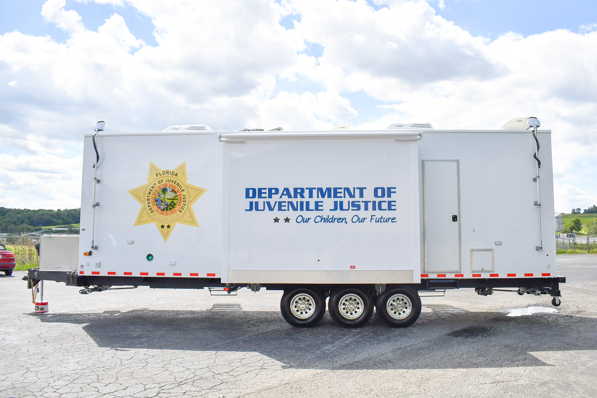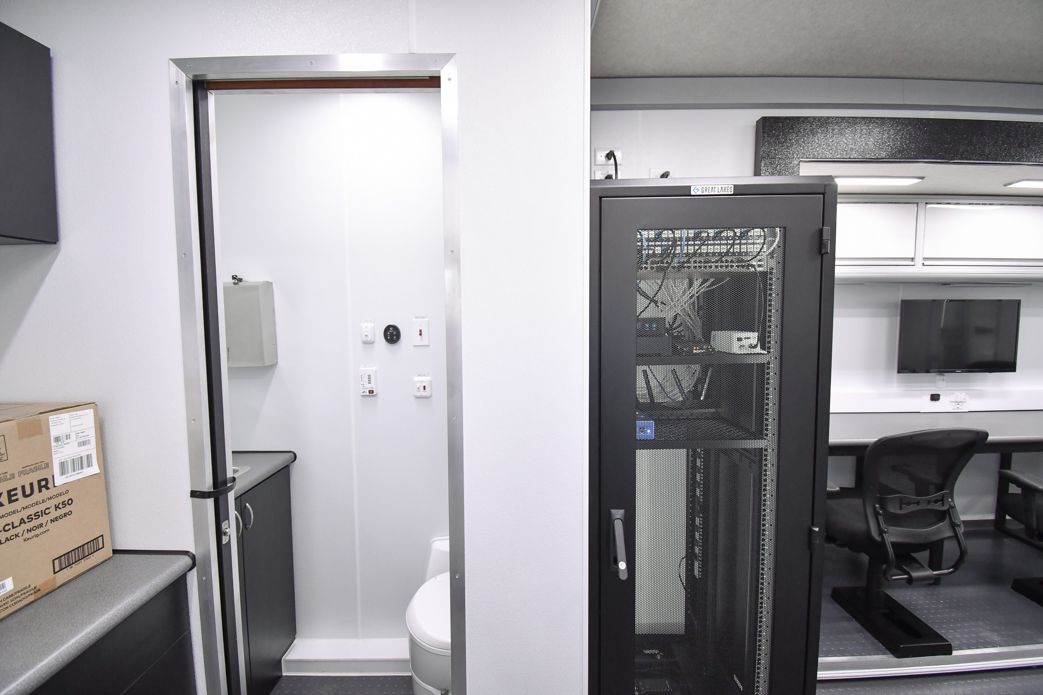This Command 35-8WS SO was custom-built for the Department of Juvenile Justice in Tallahassee, FL. In order to accommodate large groups of personnel and hold a wide variety of tech, this trailer was customized to include one electric slideout, eight workstations, one 37u equipment rack with a 48-port patch panel, two 16-outlet electrical strips, and dedicated 20-amp receptacle, one three-camera Furrion vehicle observation system with a 7″ monitor, an eight-phone Sangoma system, two 32″ TVs, one 32″ touch screen monitor, one Cradlepoint WiFi router and antenna, one Winegard DirectTV satellite with two receivers, two battery-operated smoke/CO2 alarms, and an Axis camera with a joy stick controller.