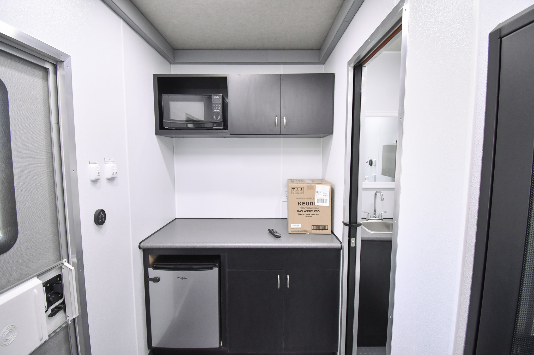 - A kitchenette with one refrigerator, microwave, and Keurig