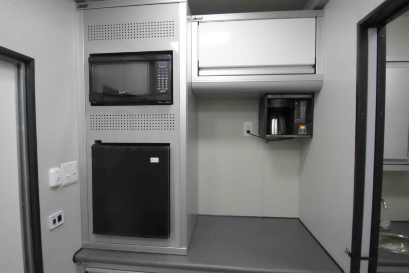 - A galley with a refrigerator, microwave, and Keurig