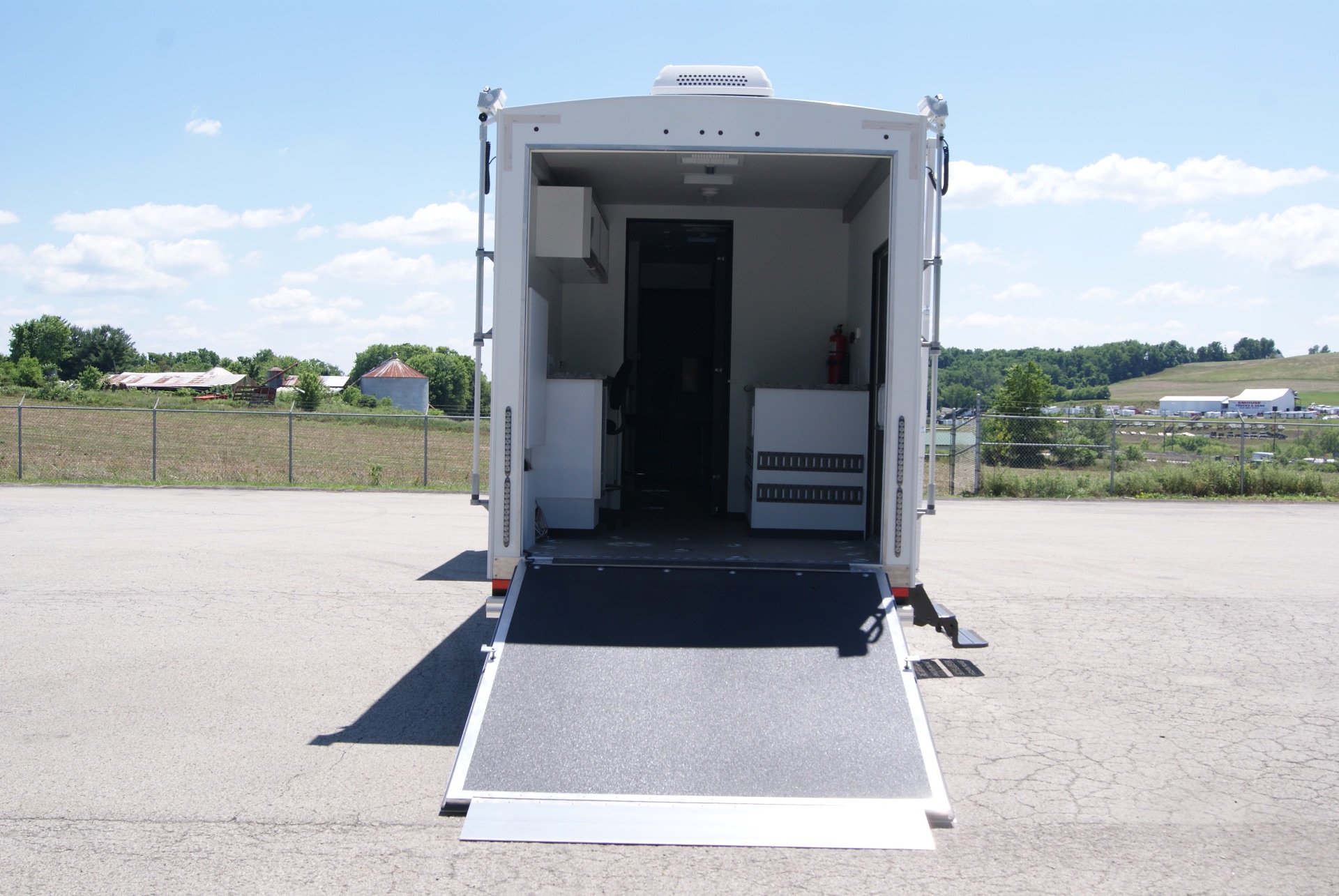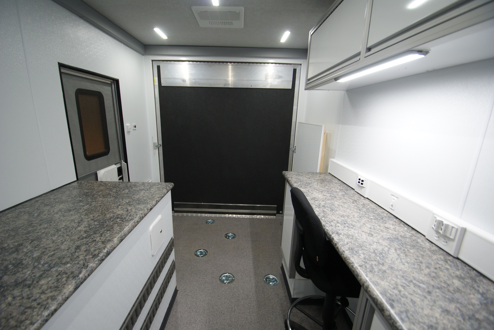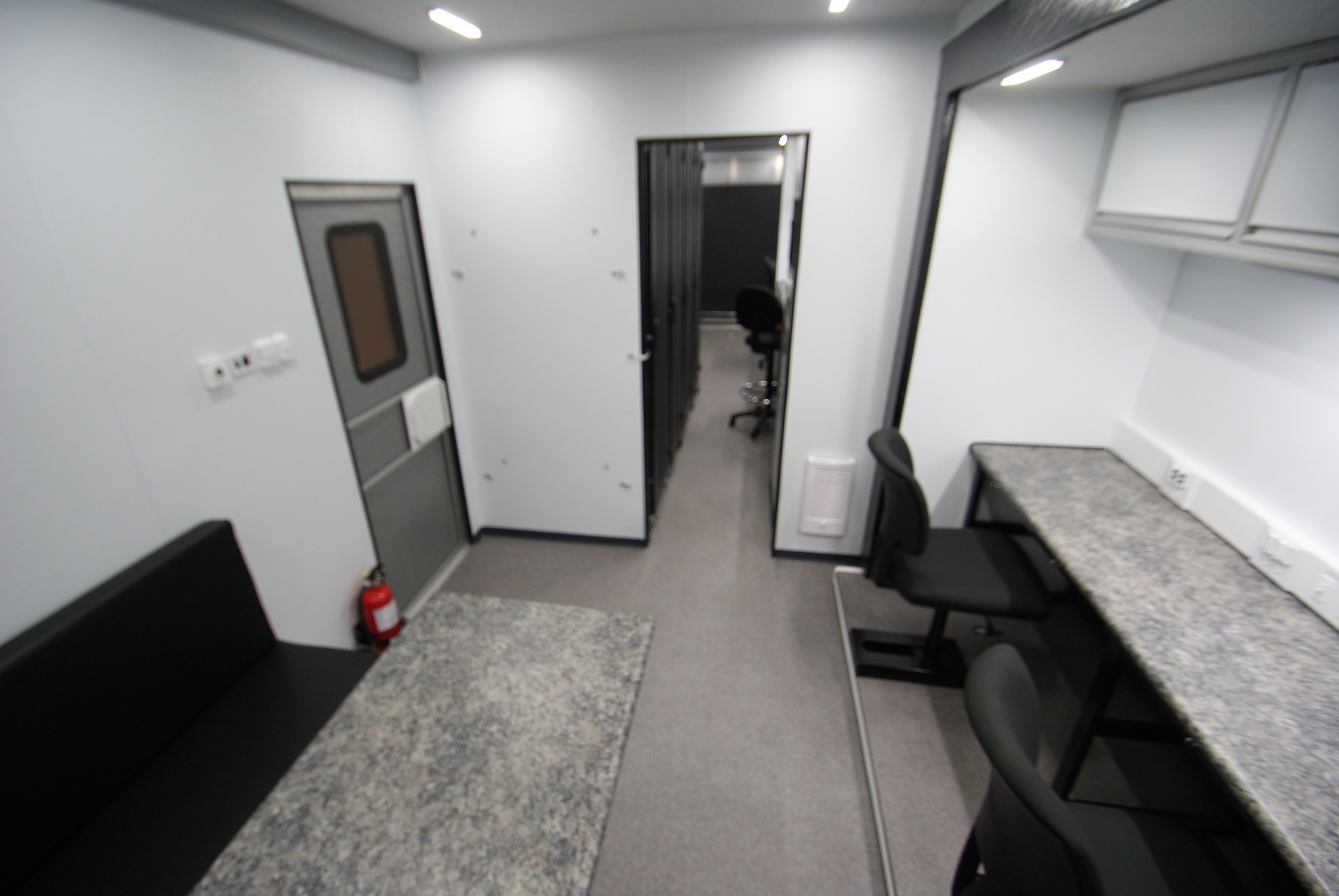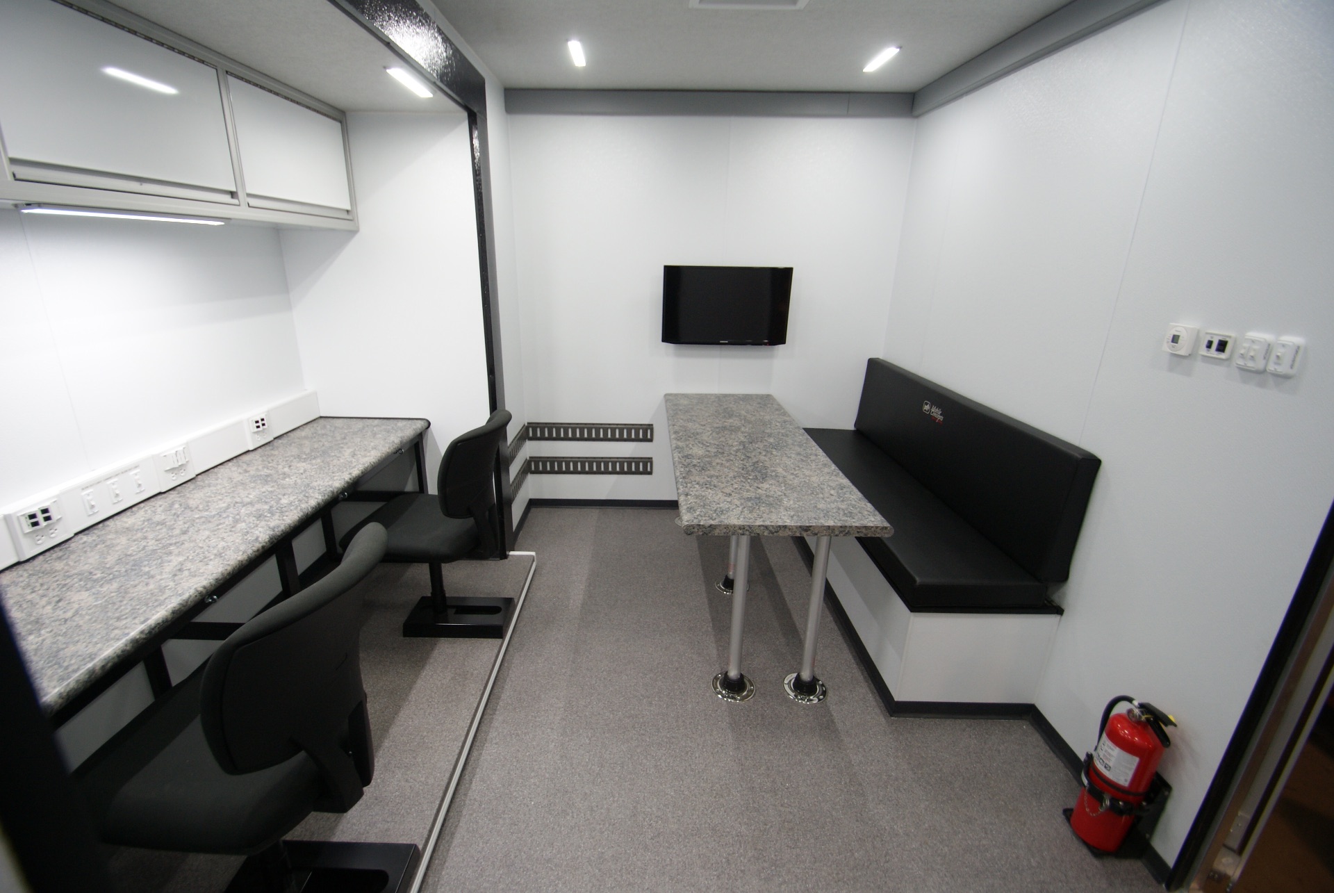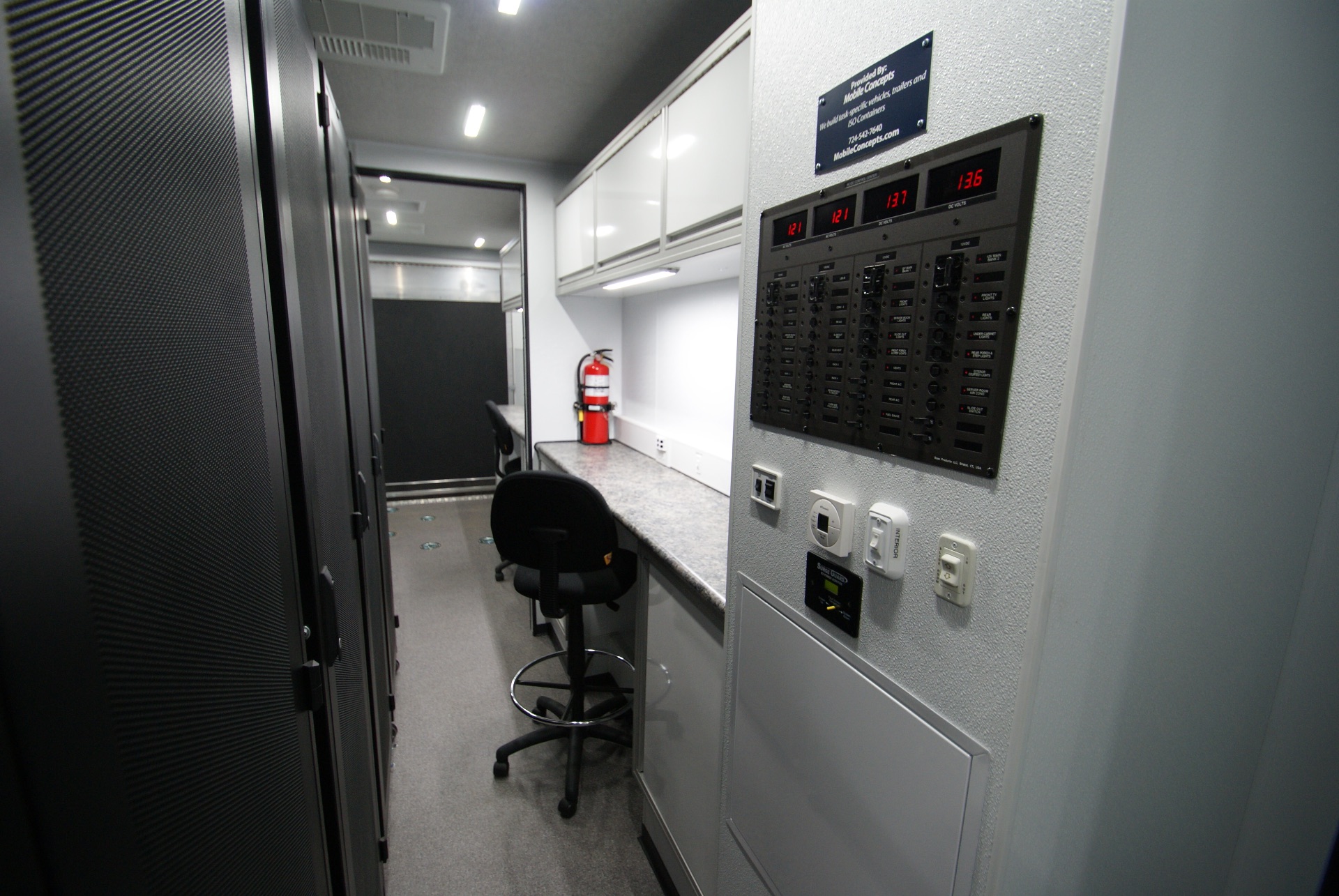 Its interior is divided into three sections: the operations area, the server room, and the work area. The operations center features two workstations, a 29″ LED TV, and a conference table with padded bench seating. The server room houses four 37U server racks with locking front mesh doors and dedicated 20-amp outlets per rack, and a single-person workstation. The work area is equipped with a Demarc electric panel with CAT6 connectivity, a single-person workstation, recessed D-rings in the floor, and a work counter with two rows of wall-mounted E-Track for customer storage. The exterior package includes a retractable awning, a reinforced walk-on roof with fixed ladder access, air ride suspension, telescopic scene lights, and LED DOT lighting.