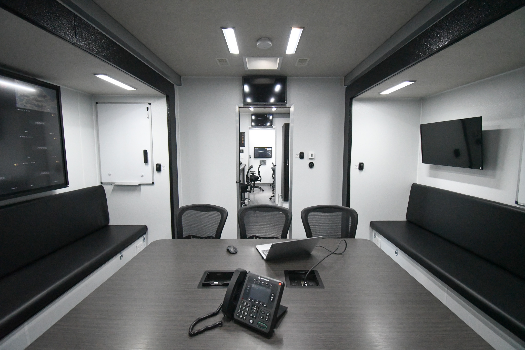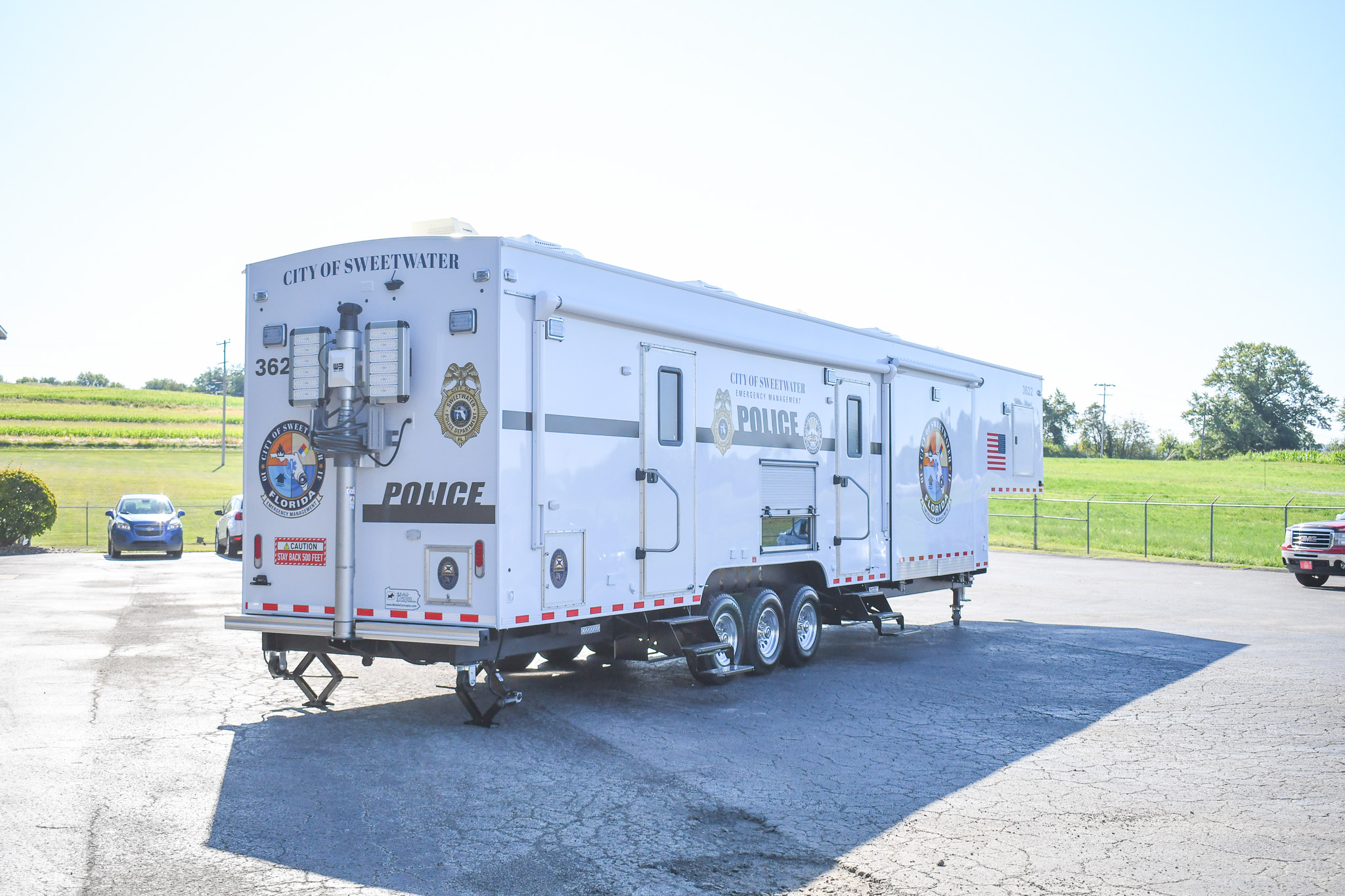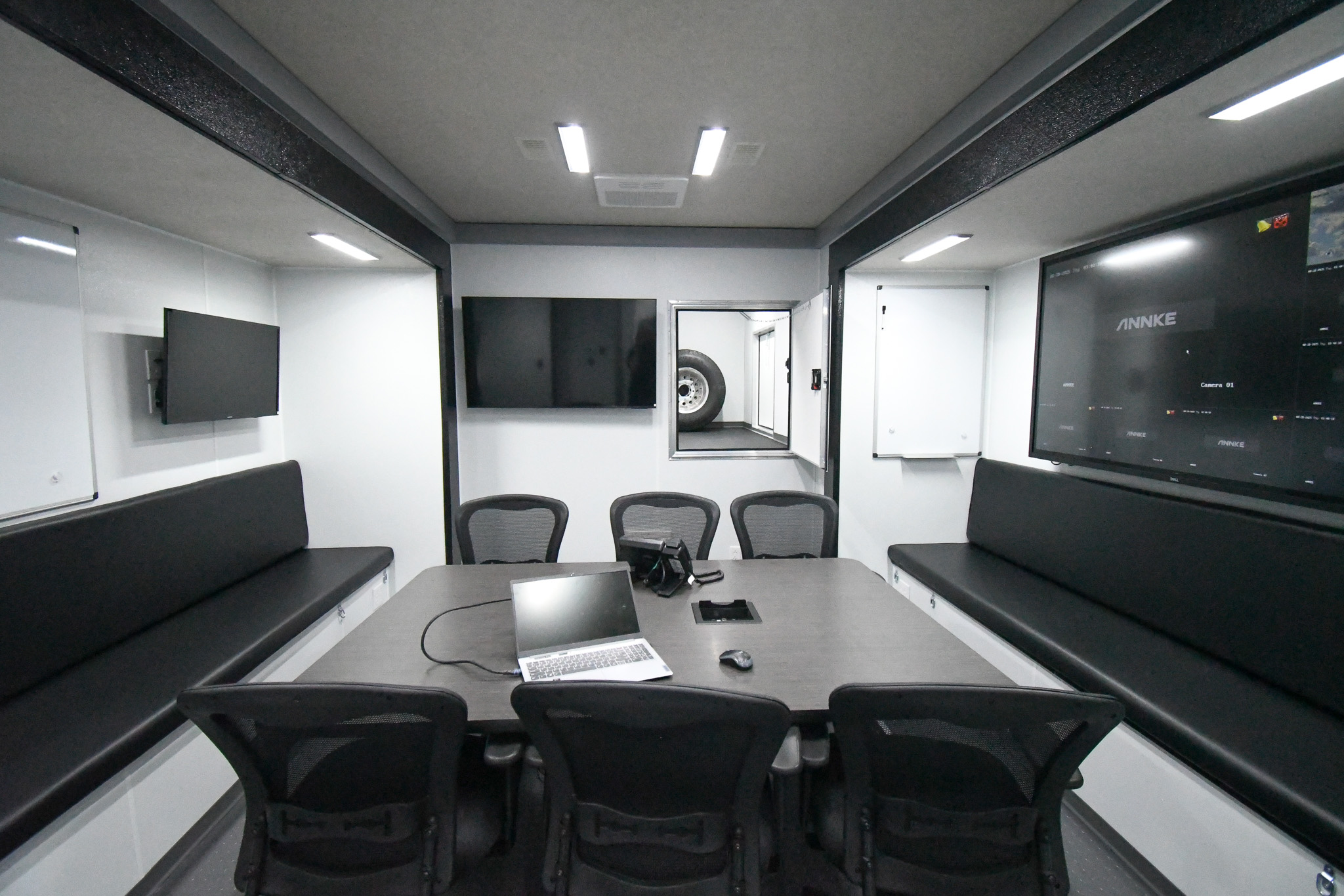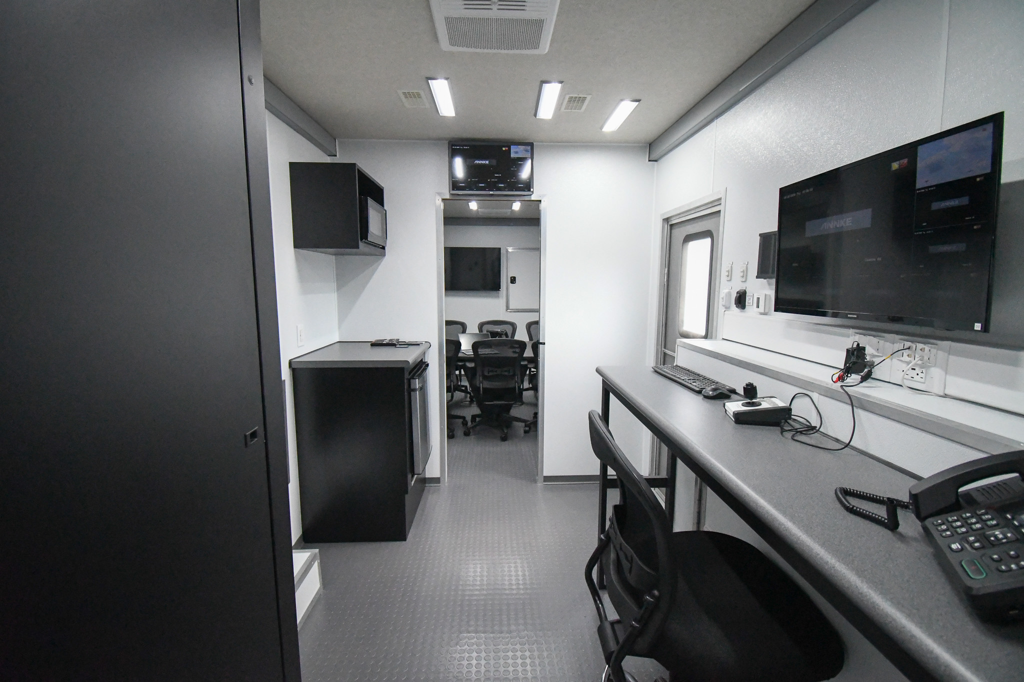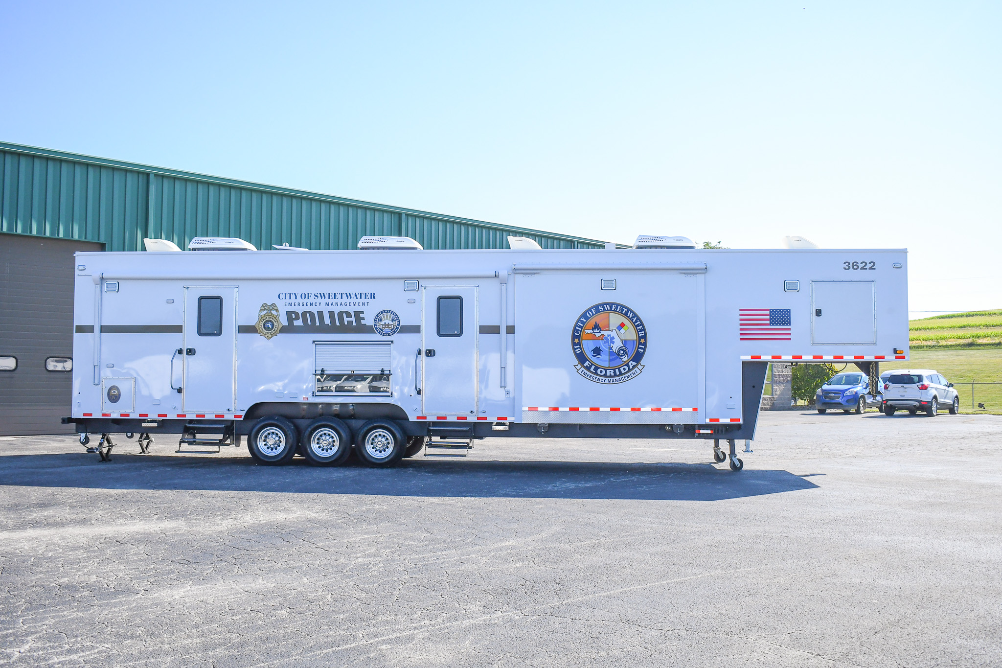 This Command 42-5WS FW 2SO was custom-built for the Sweetwater Police Department in Sweetwater, FL, to serve as a command center during emergencies. Their unit features a total of eleven workstations, one HP LaserJet printer, sixteen TVs and monitors, one 37u equipment rack with three shelves, one wormhole, two 48-port patch panels, and two Motorola radio consolettes, one Starlink antenna, two Vanco transmitters, a conference room with ample seating, a kitchenette, fifth-wheel storage space, and two electric slideouts. For added security and visibility, the trailer was equipped with one Night Scan vertical light tower with a Wonwoo camera, a 3-camera Furrion wireless observation system, twelve LED FRC 12v scene lights, and eight Whelen red/blue emergency lights.