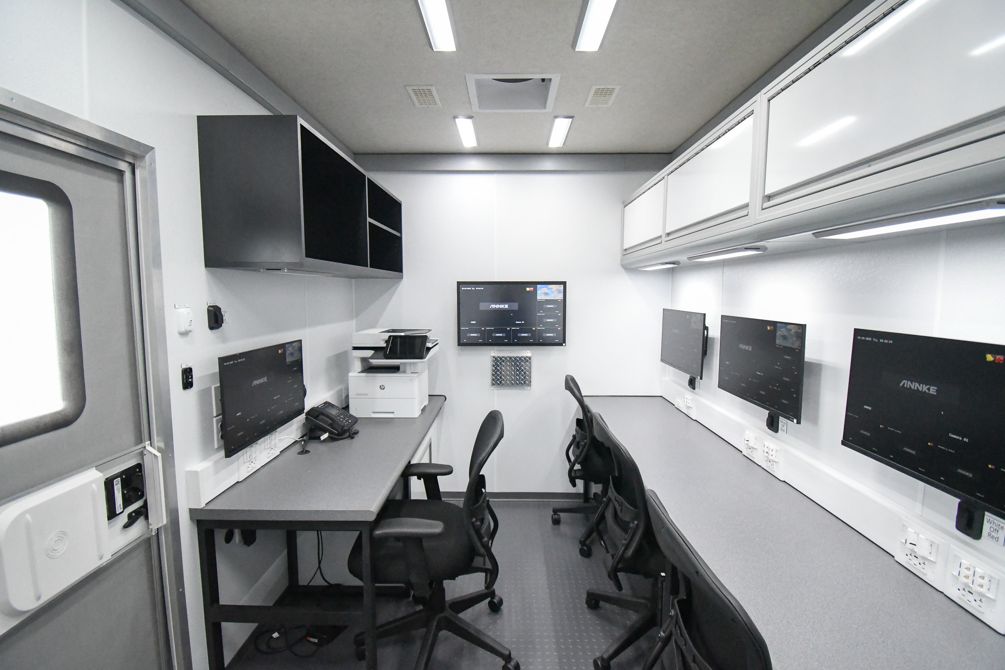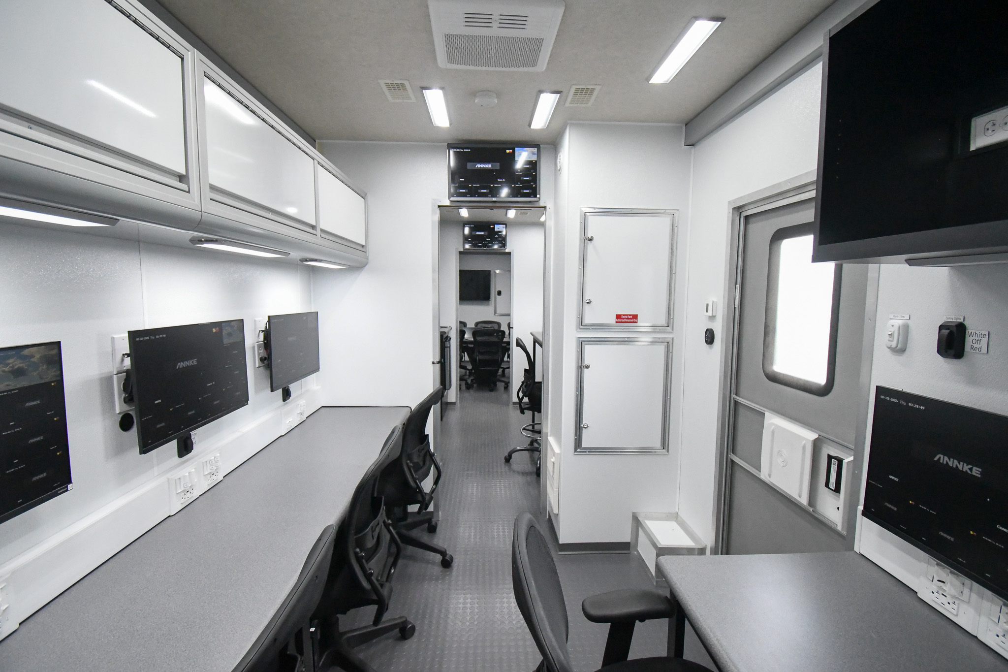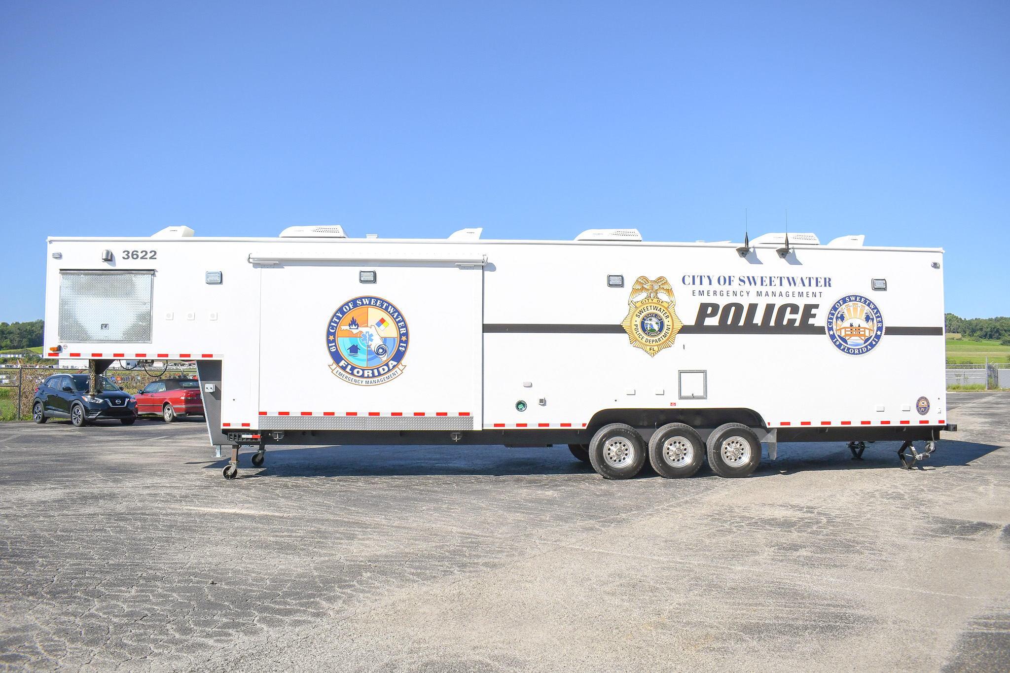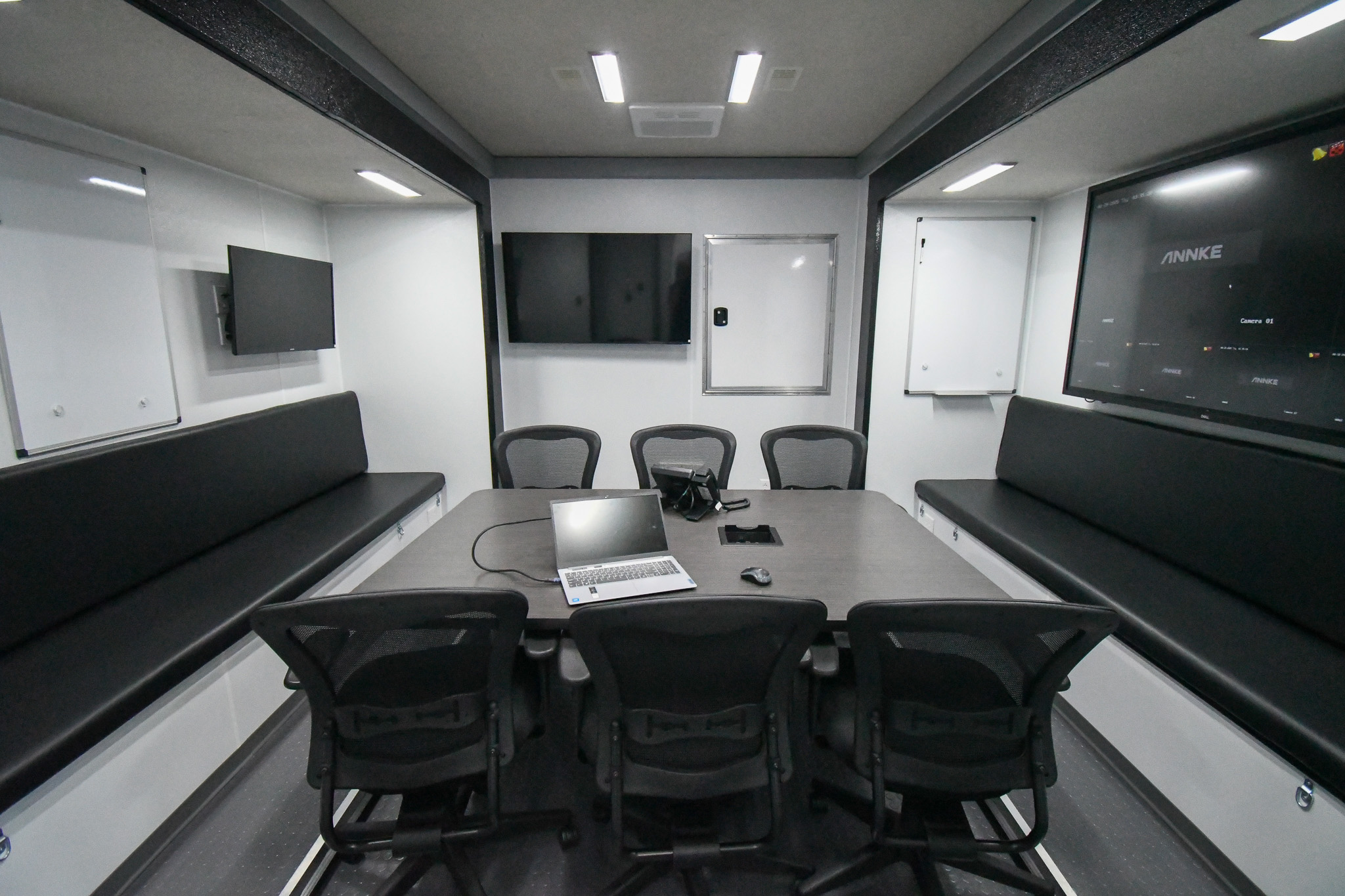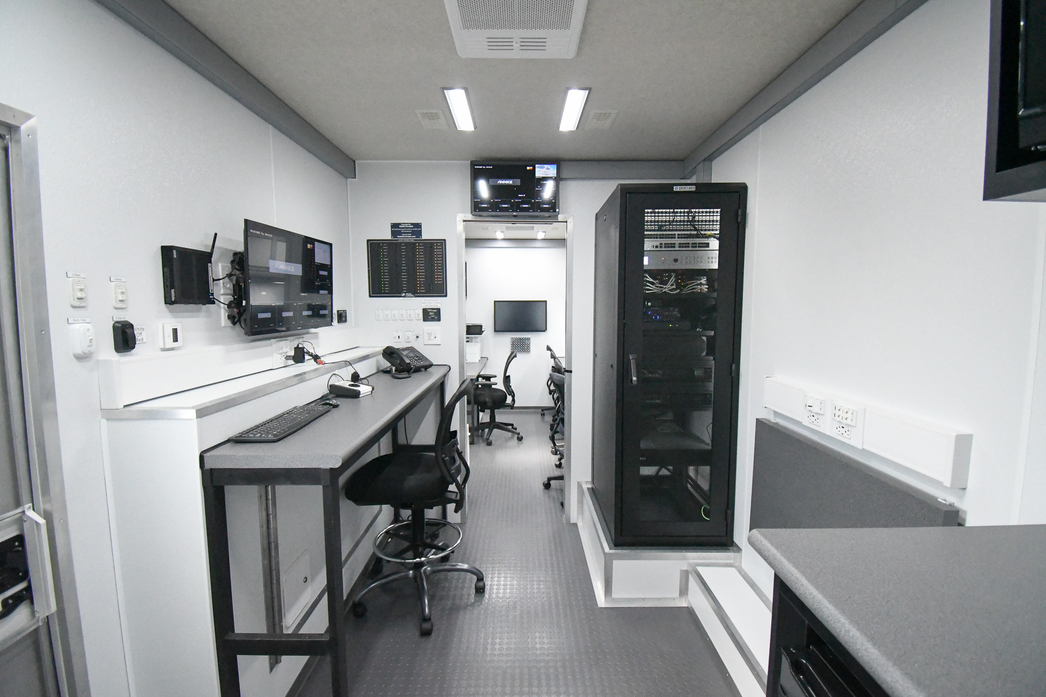 This Command 42-5WS FW 2SO was custom-built for the Sweetwater Police Department in Sweetwater, FL, to serve as a command center during emergencies. Their unit features a total of eleven workstations, one HP LaserJet printer, sixteen TVs and monitors, one 37u equipment rack with three shelves, one wormhole, two 48-port patch panels, and two Motorola radio consolettes, one Starlink antenna, two Vanco transmitters, a conference room with ample seating, a kitchenette, fifth-wheel storage space, and two electric slideouts. For added security and visibility, the trailer was equipped with one Night Scan vertical light tower with a Wonwoo camera, a 3-camera Furrion wireless observation system, twelve LED FRC 12v scene lights, and eight Whelen red/blue emergency lights.