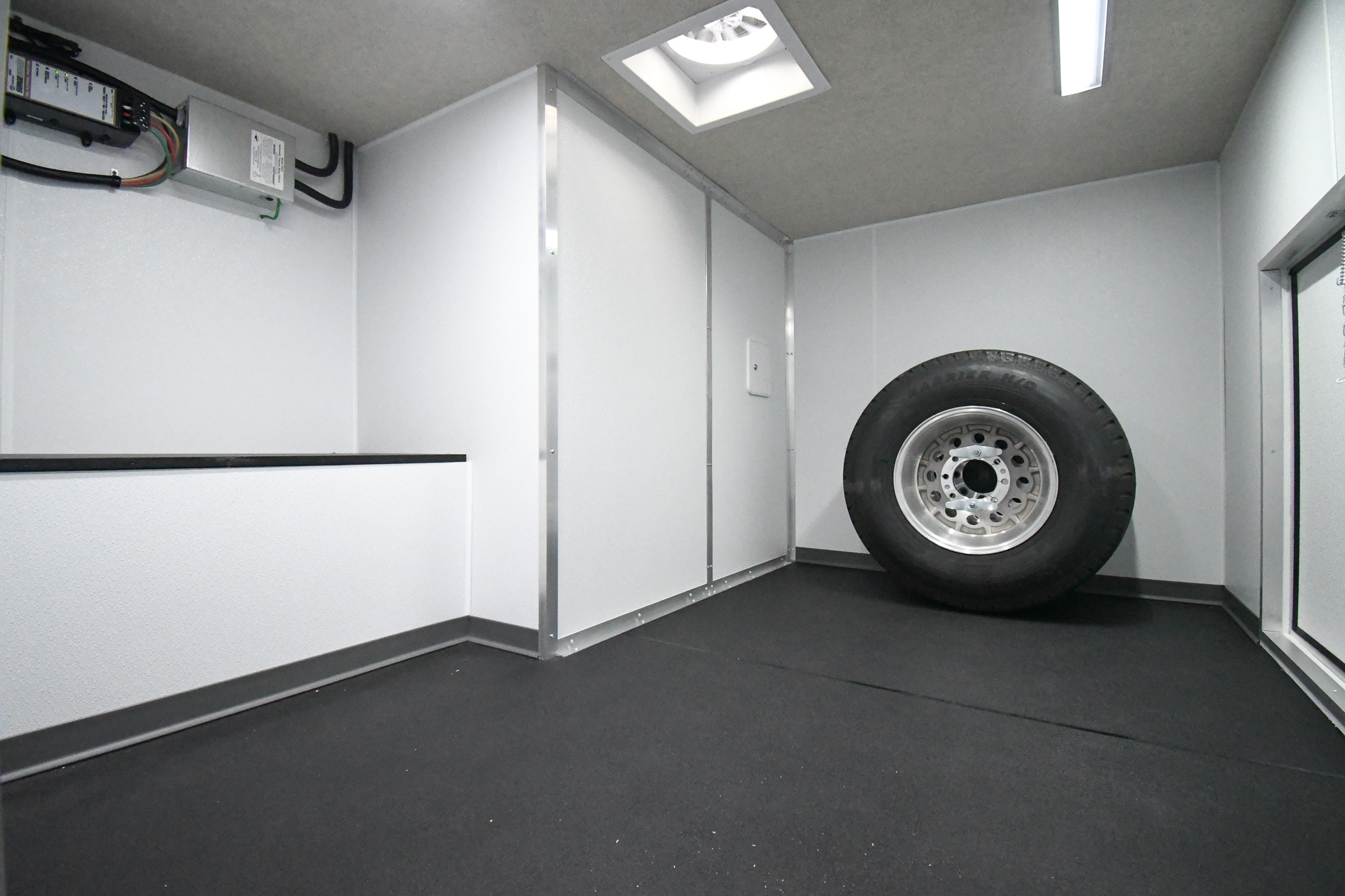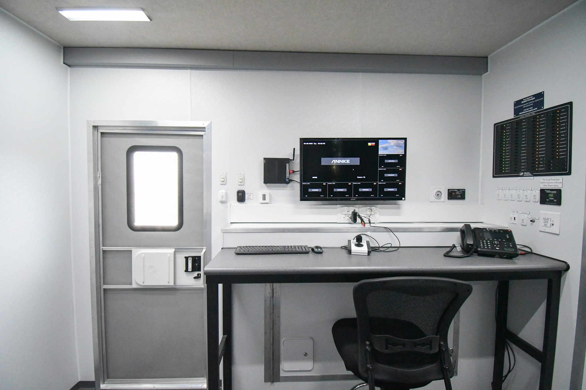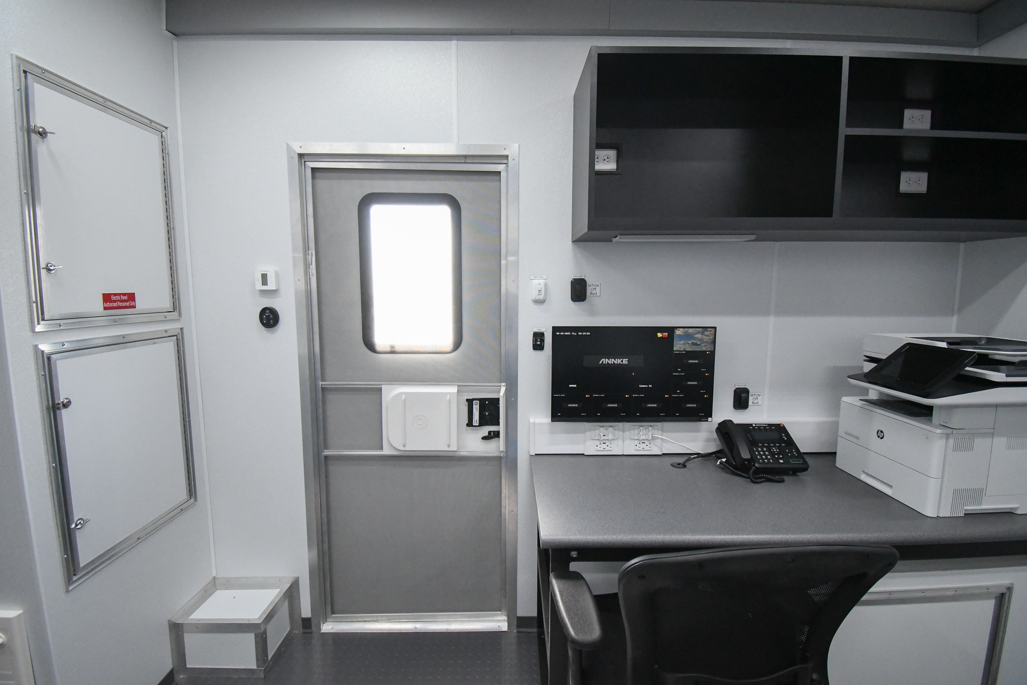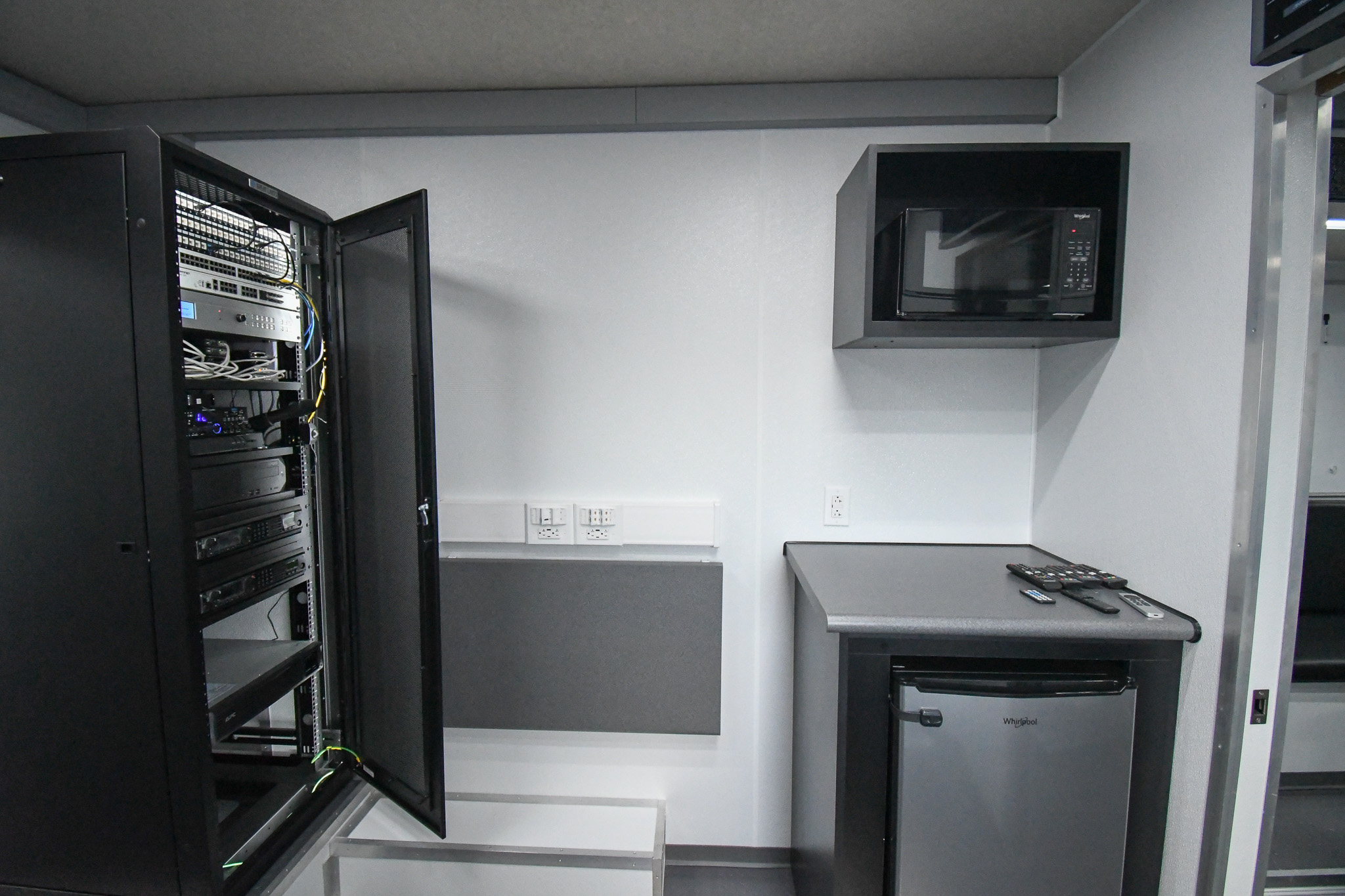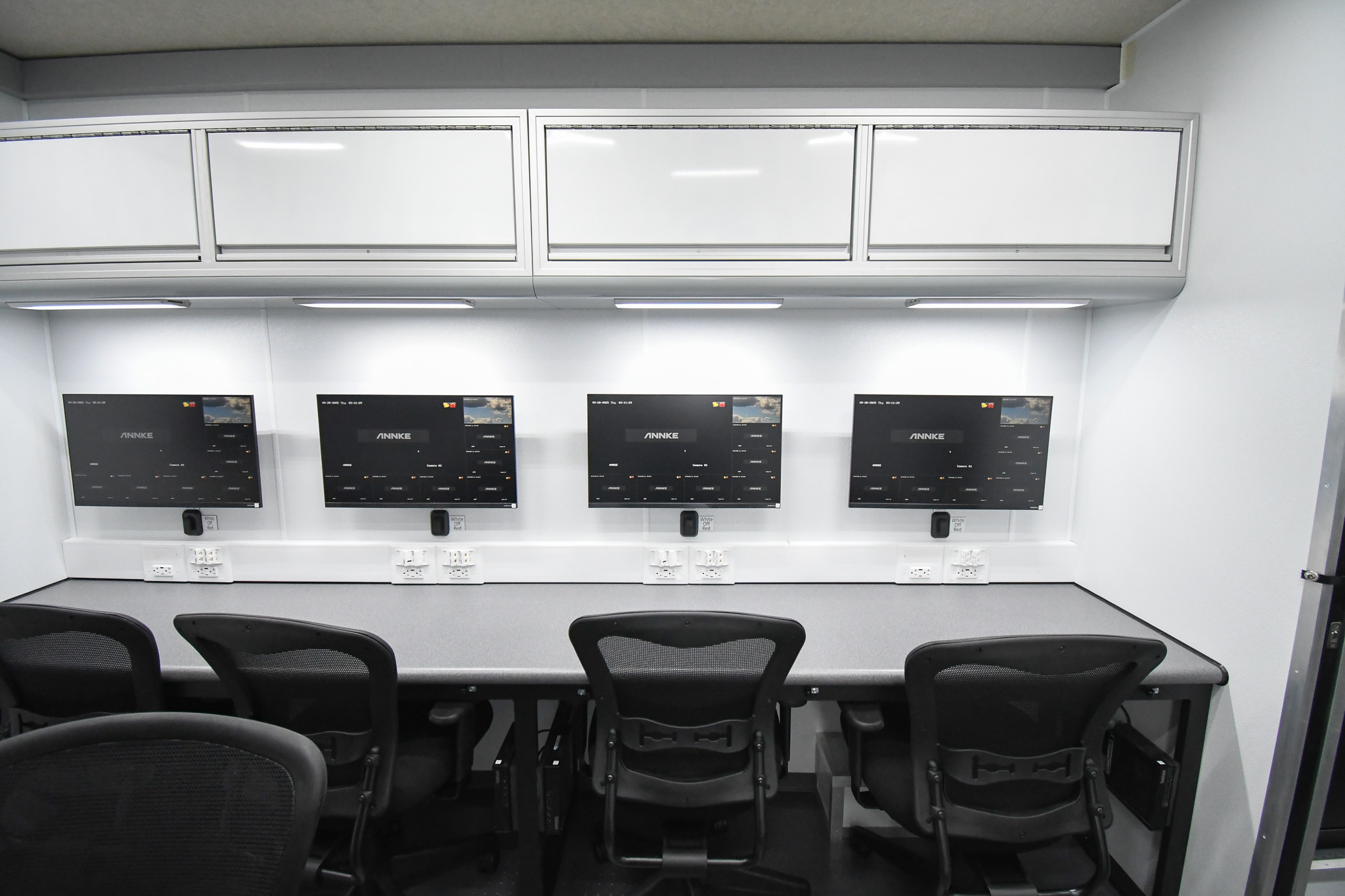 This Command 42-5WS FW 2SO was custom-built for the Sweetwater Police Department in Sweetwater, FL, to serve as a command center during emergencies. Their unit features a total of eleven workstations, one HP LaserJet printer, sixteen TVs and monitors, one 37u equipment rack with three shelves, one wormhole, two 48-port patch panels, and two Motorola radio consolettes, one Starlink antenna, two Vanco transmitters, a conference room with ample seating, a kitchenette, fifth-wheel storage space, and two electric slideouts. For added security and visibility, the trailer was equipped with one Night Scan vertical light tower with a Wonwoo camera, a 3-camera Furrion wireless observation system, twelve LED FRC 12v scene lights, and eight Whelen red/blue emergency lights.