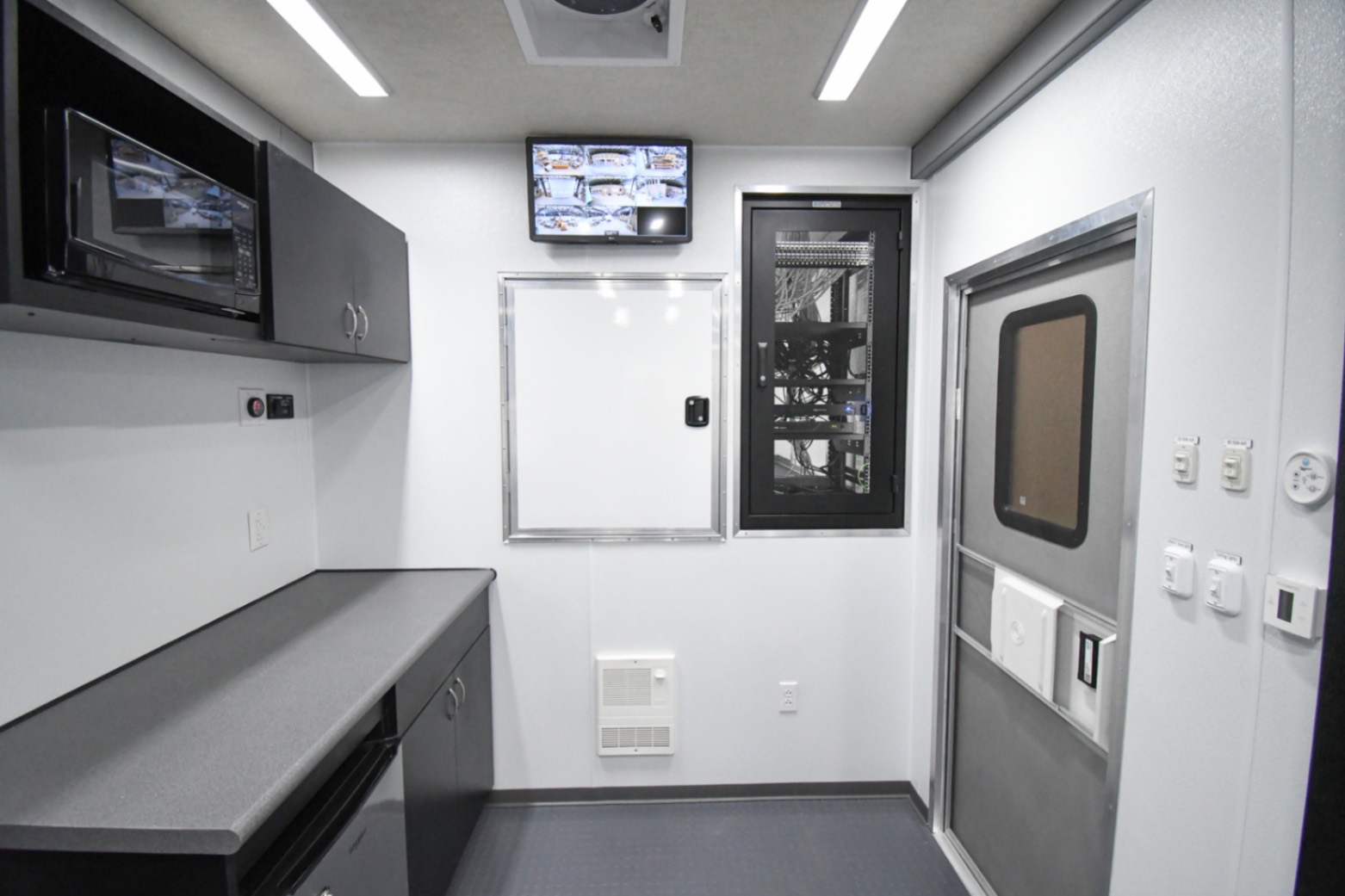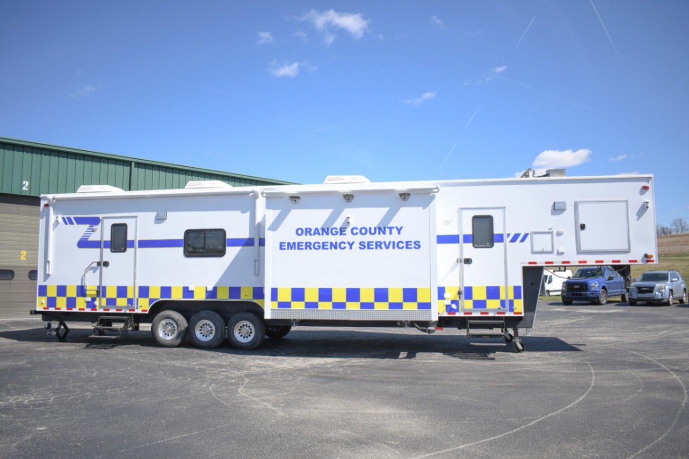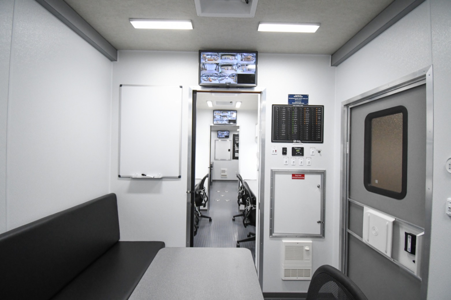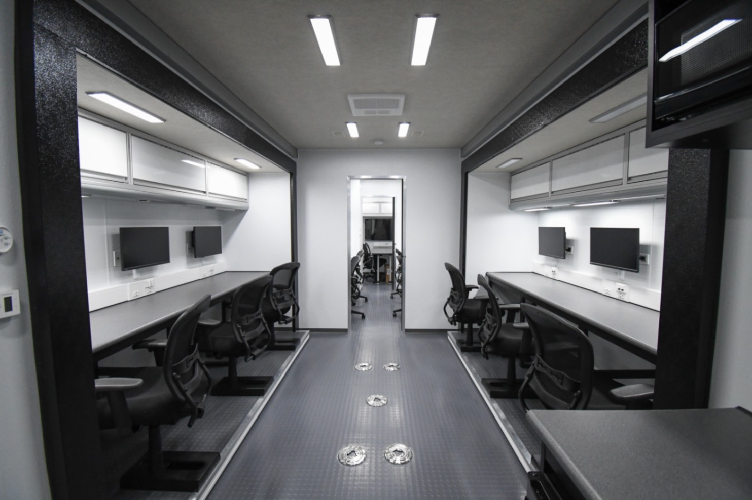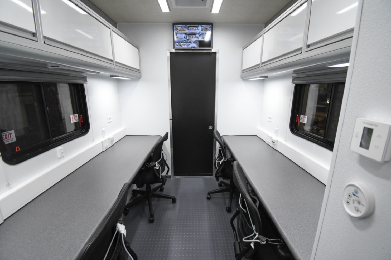 This Command 42-6WS FW 2SO was custom-built for the Orange County Emergency Services Department in Hillsborough, NC, to function as a fully-equipped Emergency Operations Center. Their specialized unit features two electric slide-outs, six workstations outfitted with mounted task chairs and 24″ computer monitors, a kitchenette, a fifth wheel storage area, and a Furrion Vision S Wireless vehicle observation system. Additionally, there’s a dedicated conference room with a removable table and a 40″ LED TV with Blu-ray capability. Communication and security systems include three radios and one eight dome camera Vivotek surveillance system. A 24U equipment rack houses a 24-port patch panel and other essential components, supporting a wide range of operational needs.