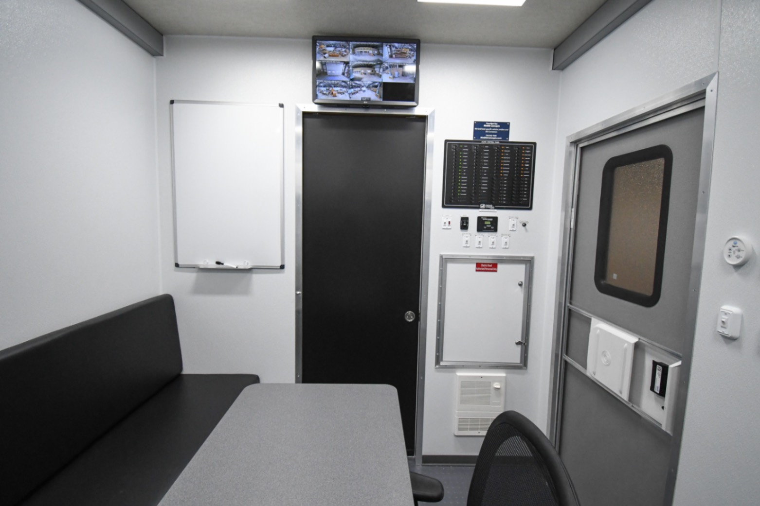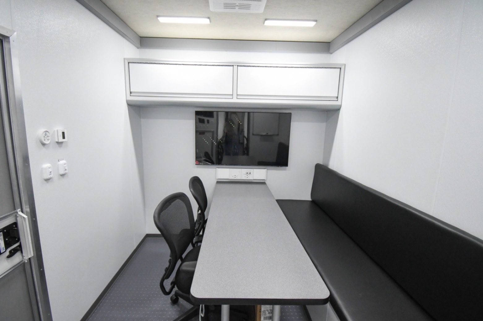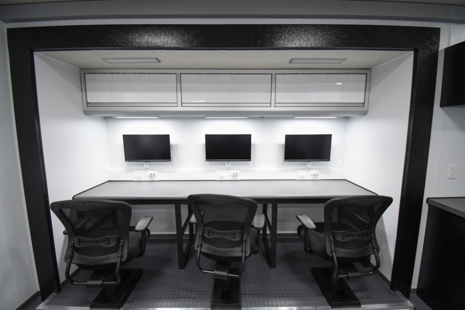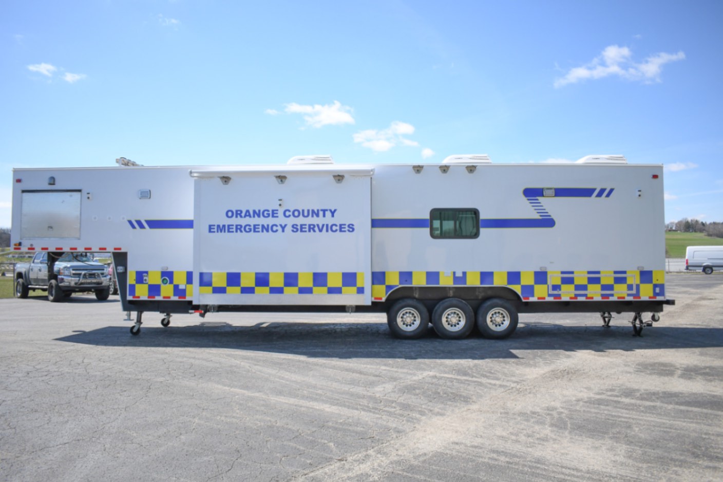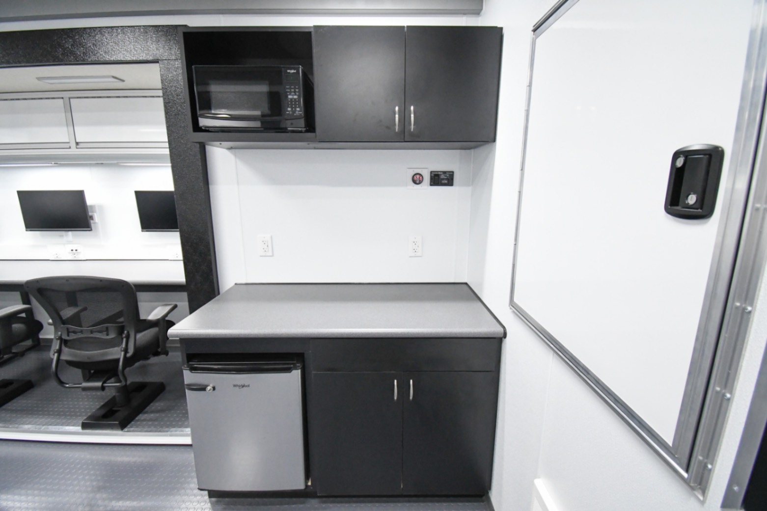 This Command 42-6WS FW 2SO was custom-built for the Orange County Emergency Services Department in Hillsborough, NC, to function as a fully-equipped Emergency Operations Center. Their specialized unit features two electric slide-outs, six workstations outfitted with mounted task chairs and 24″ computer monitors, a kitchenette, a fifth wheel storage area, and a Furrion Vision S Wireless vehicle observation system. Additionally, there’s a dedicated conference room with a removable table and a 40″ LED TV with Blu-ray capability. Communication and security systems include three radios and one eight dome camera Vivotek surveillance system. A 24U equipment rack houses a 24-port patch panel and other essential components, supporting a wide range of operational needs.