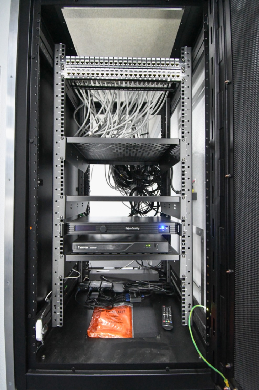 - Electronics rack: One 24u electronics rack with a 24-port patch panel