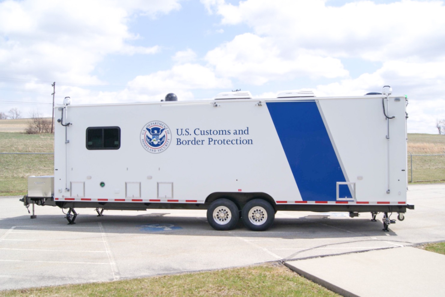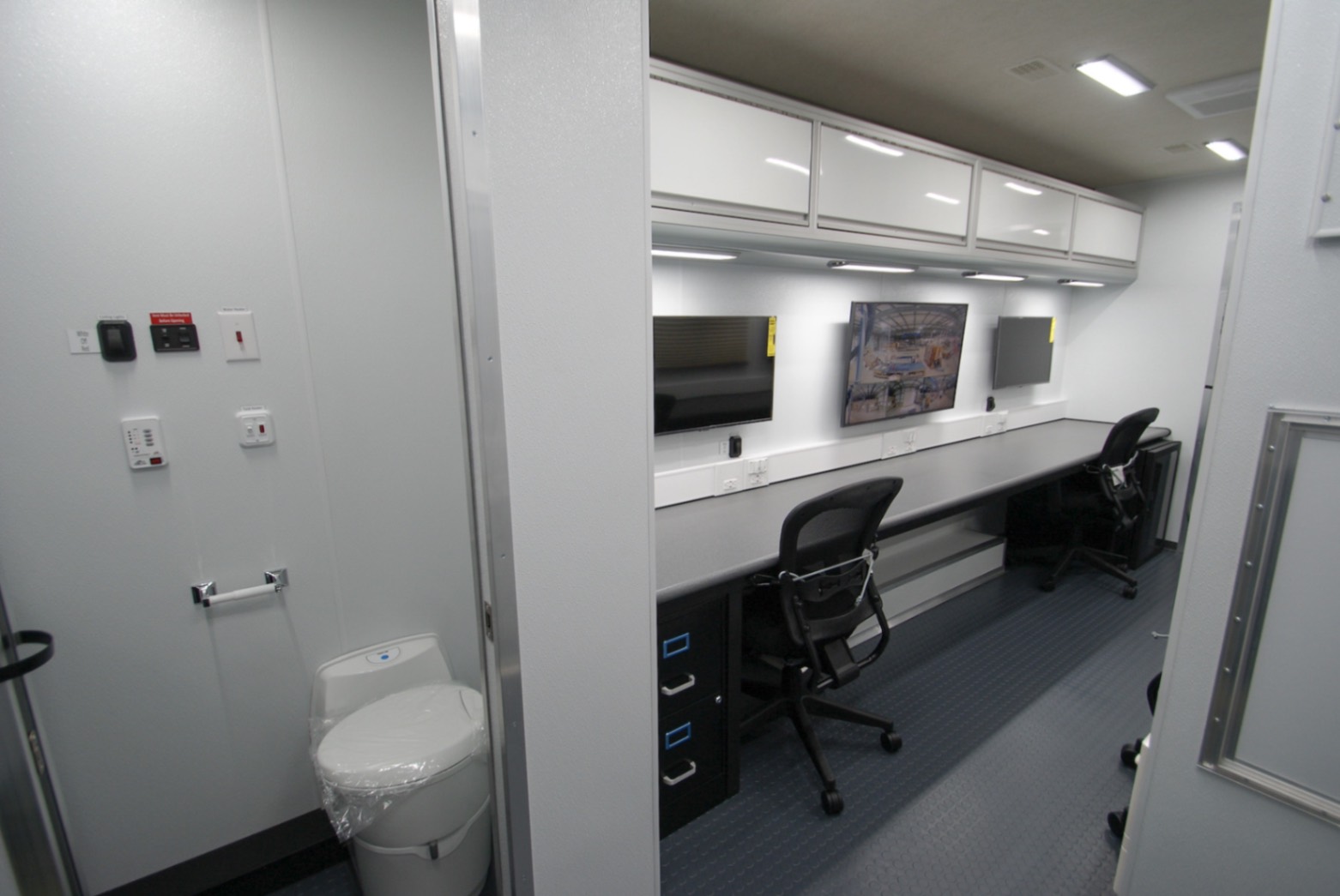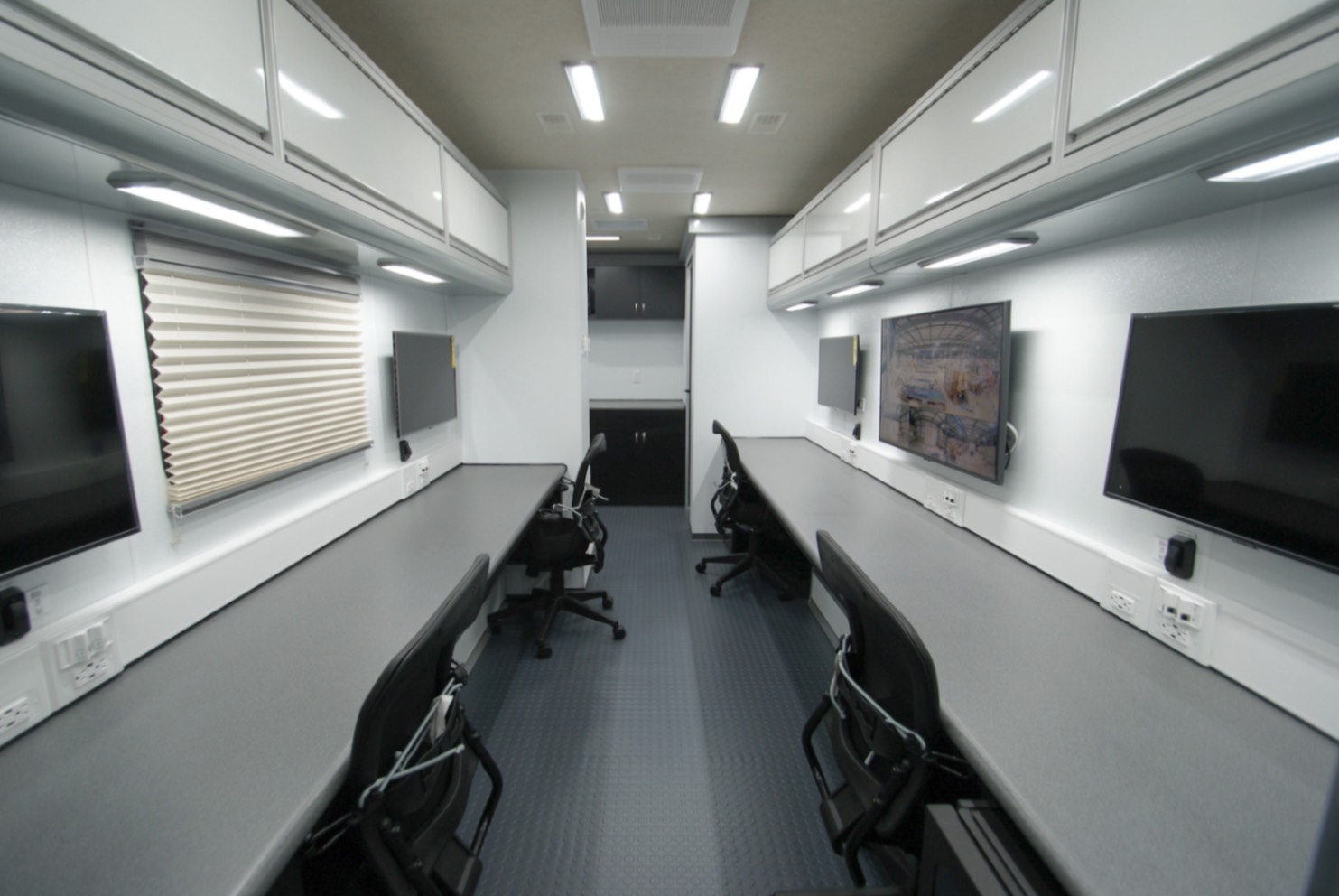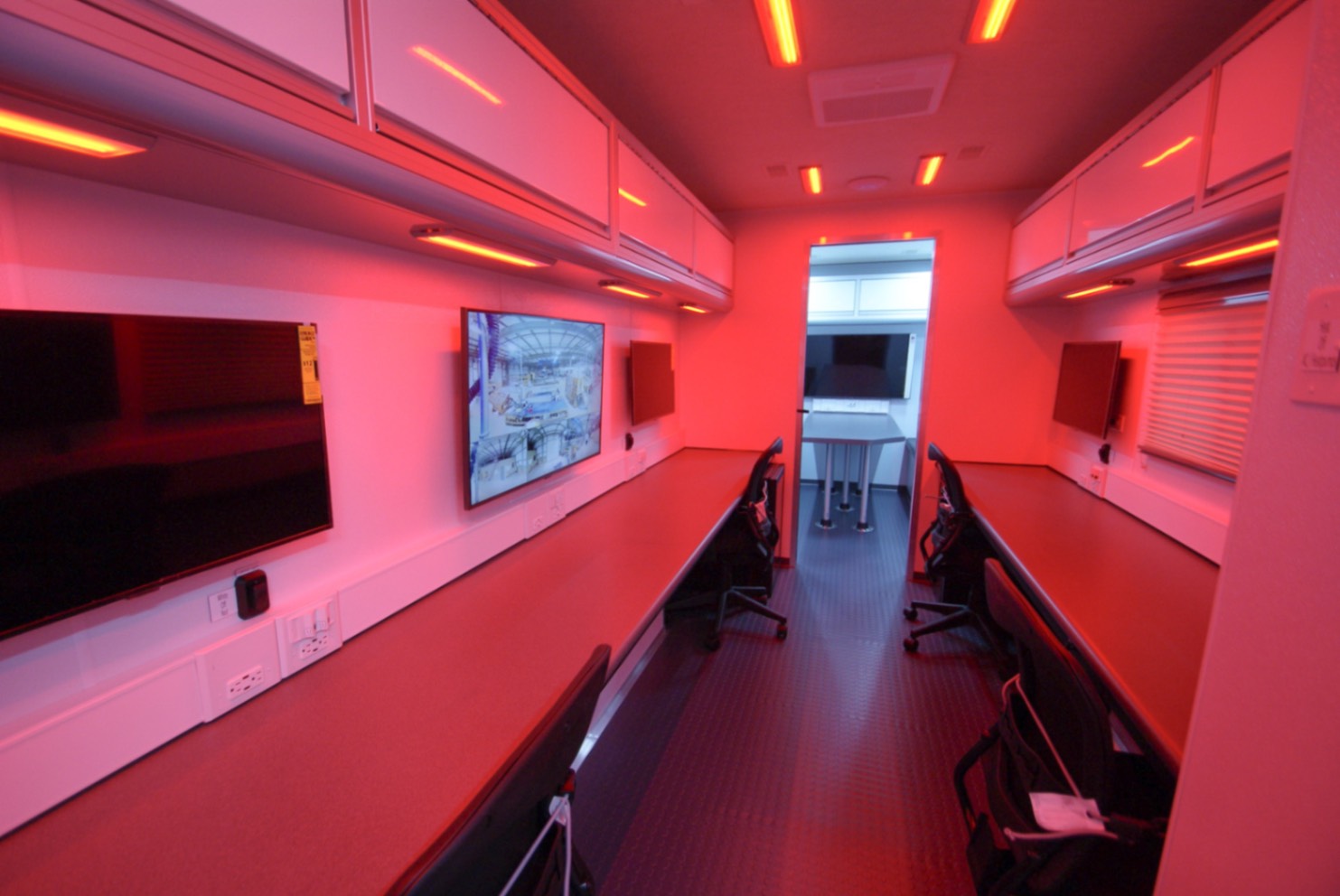 This Command MCAP 35 was purpose-built to function as a Mobile Command and Processing Center for the U.S. Customs and Border Protection agency. Designed for operational efficiency and mobility, this 35′ trailer is divided int four functional zones: a private conference room, a dedication workstation area, a galley, and a bathroom.
