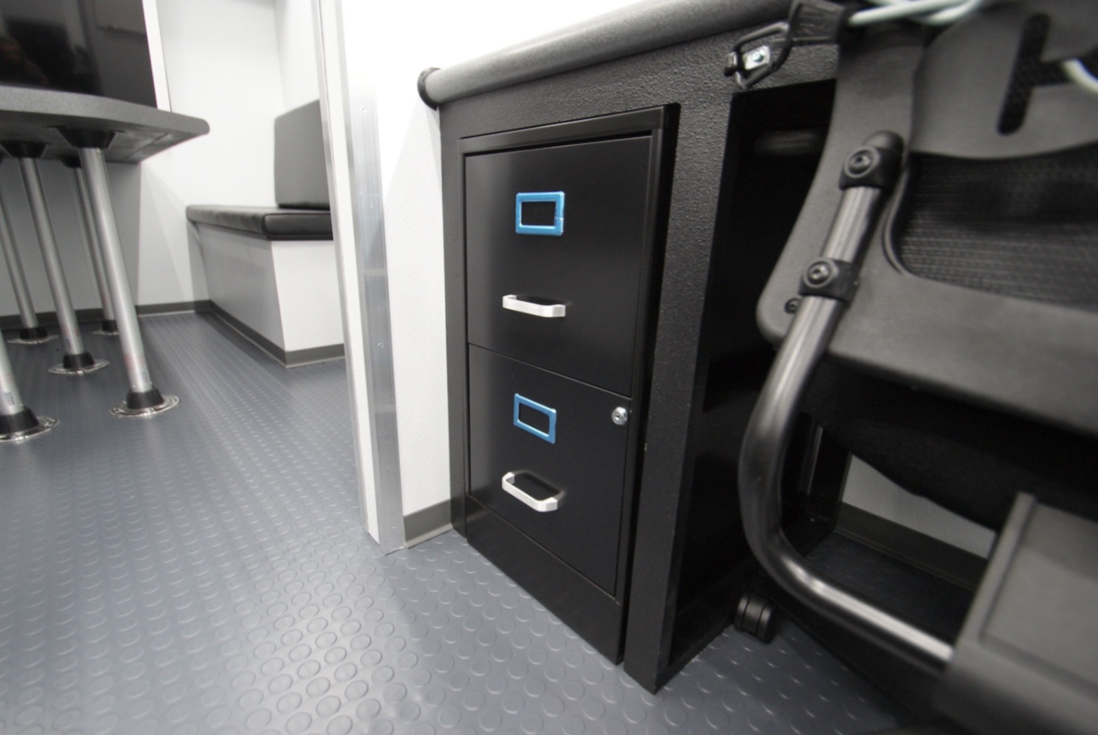 The conference room comfortably seats seven people and includes a pocked door for added privacy, making it ideal for briefings and secure discussions. The workstation area features four fully pre-wired stations equipped with 110v and 10v power outlets, CAT6 networking ports, and a shared antenna- ensuring seamless connectivity and reliable communication capabilities in the field. Built to support mission-critical operations, the Command MCAP 35 provides a flexible and secure environment for CBP personnel wherever they’re deployed.