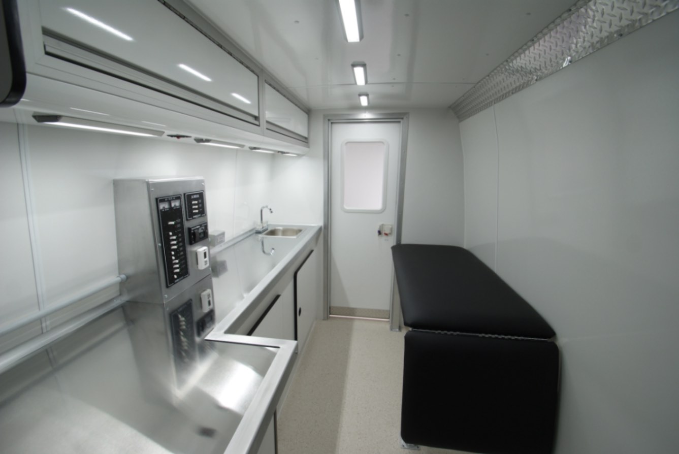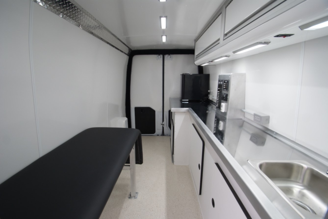 This setup provides a durable, hygienic, and highly functional environment ideal for medical and outreach applications. Contact us today to learn more about the benefits of our custom built Mobile Medical Van.